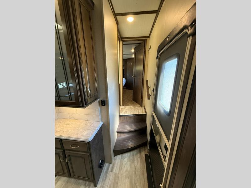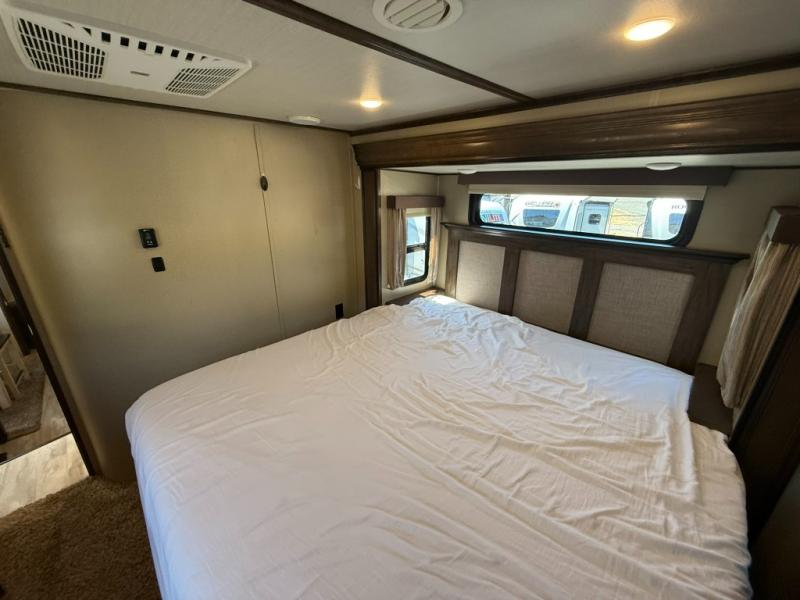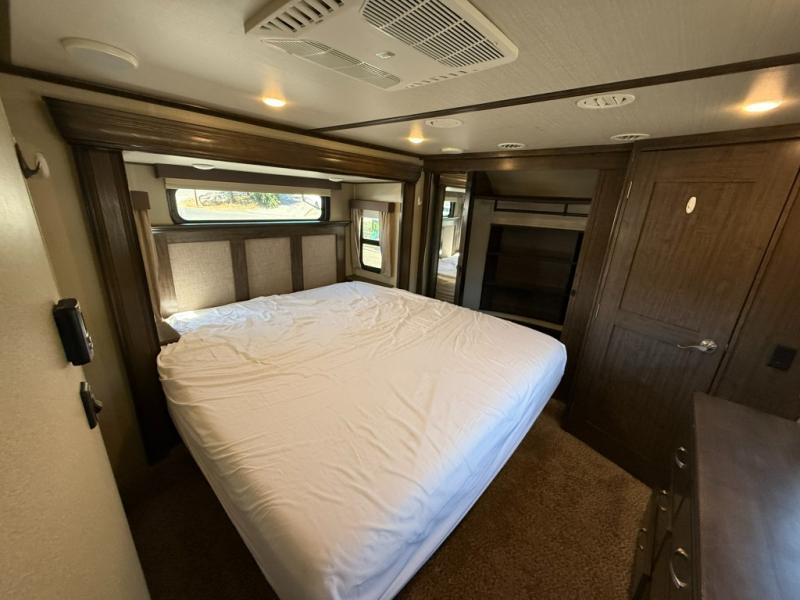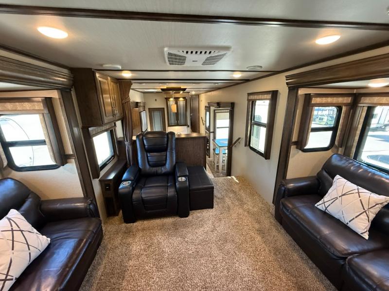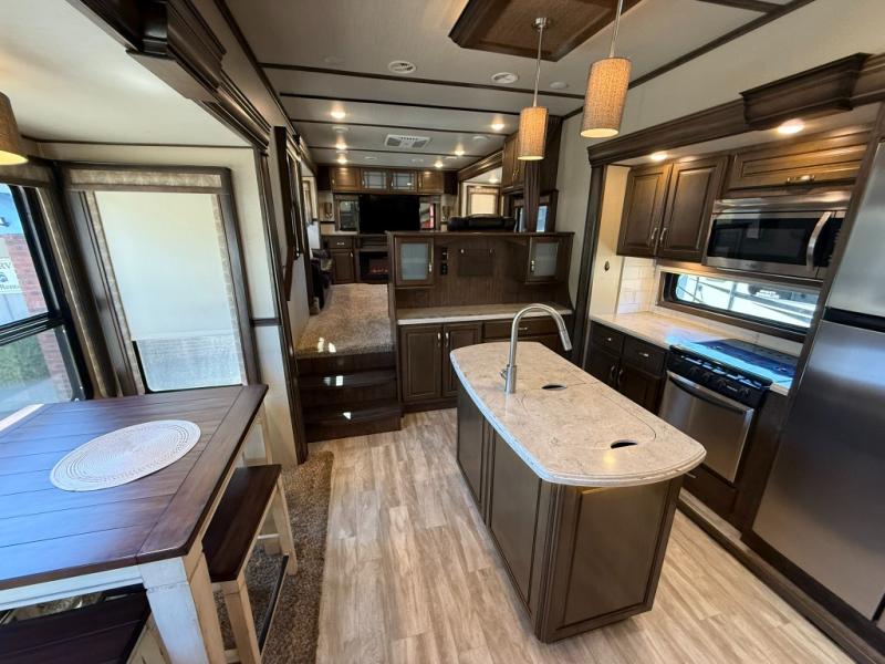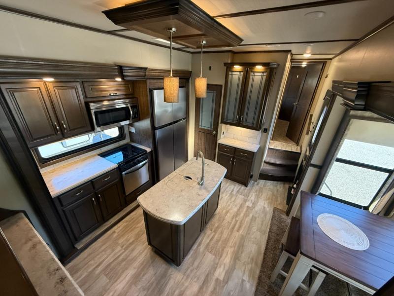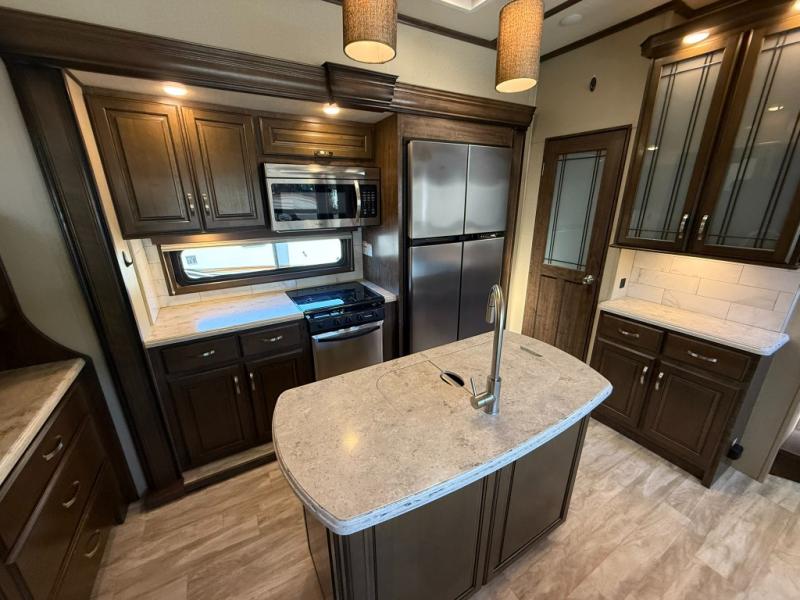 This Solitude 375RES fifth wheel allows you to travel with all the comforts of home including plenty of interior floor space to move around, extra sleeping space for the kids or grandkids, and plenty of storage for everything you might need for an extended stay. The unique exterior rear storage includes a sliding tray allowing easy access to the gear in the back. Inside, the front master bedroom will not disappoint with a pullout ottoman, flip-top dresser, and a TV to mention a few features. The cook will surely love making meals with the professional grade stainless steel cooktop, built-in oven and convection microwave. The popular kitchen island, stainless steel 18 cu. ft. four door refrigerator, and large pantry are sure to impress. The buffet adds additional counter space to serve food or place your keys and things. You might even decide to add a few options such as a washer and dryer to keep your clothes clean the whole time, a king size bed for more sleeping surface, or even a pull-out kitchen to make meals outdoors. There are many features and plenty of space for everyone!