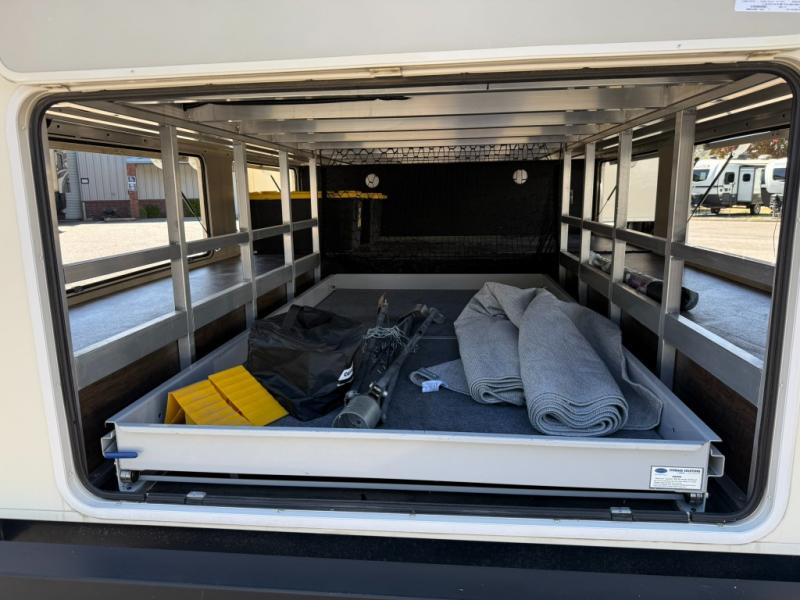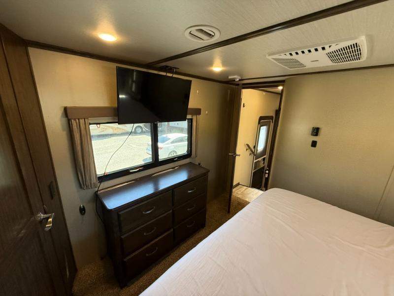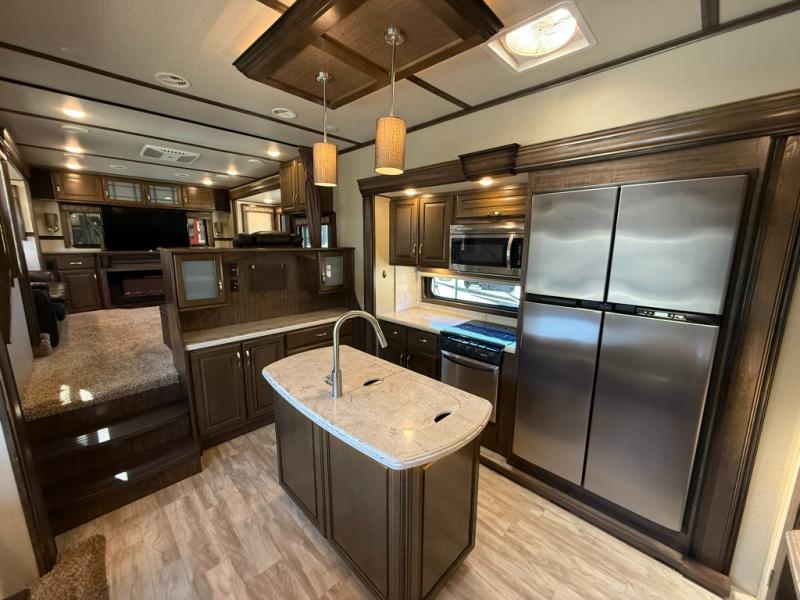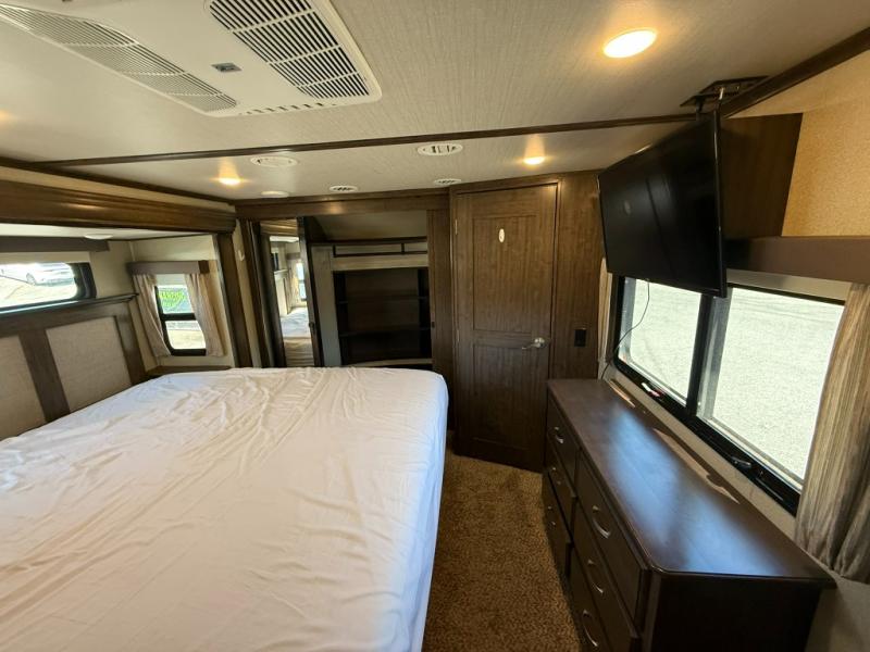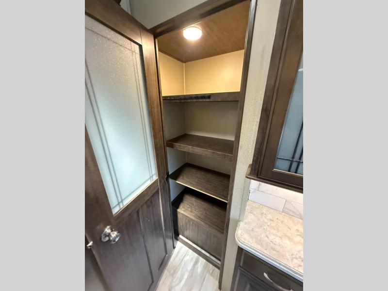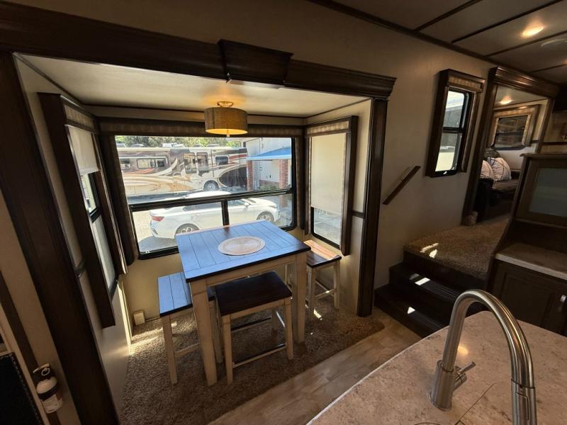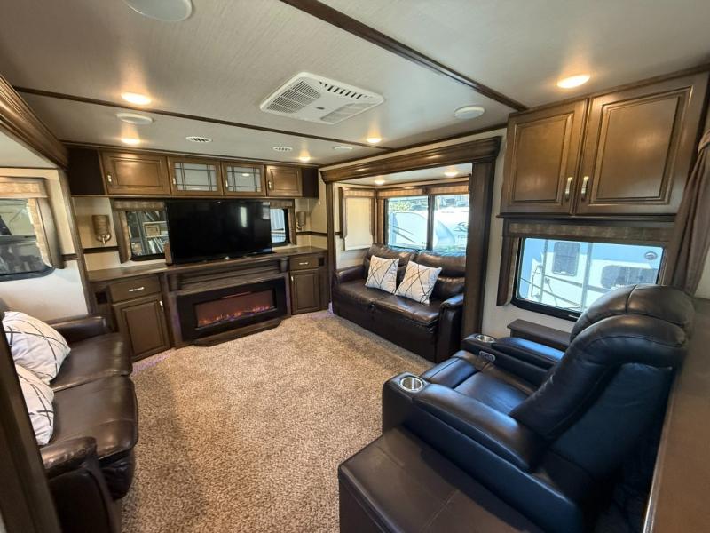 This Solitude 375RES fifth wheel allows you to travel with all the comforts of home including plenty of interior floor space to move around, extra sleeping space for the kids or grandkids, and plenty of storage for everything you might need for an extended stay. The unique exterior rear storage includes a sliding tray allowing easy access to the gear in the back. Inside, the front master bedroom will not disappoint with a pullout ottoman, flip-top dresser, and a TV to mention a few features. The cook will surely love making meals with the professional grade stainless steel cooktop, built-in oven and convection microwave. The popular kitchen island, stainless steel 18 cu. ft. four door refrigerator, and large pantry are sure to impress. The buffet adds additional counter space to serve food or place your keys and things. You might even decide to add a few options such as a washer and dryer to keep your clothes clean the whole time, a king size bed for more sleeping surface, or even a pull-out kitchen to make meals outdoors. There are many features and plenty of space for everyone!