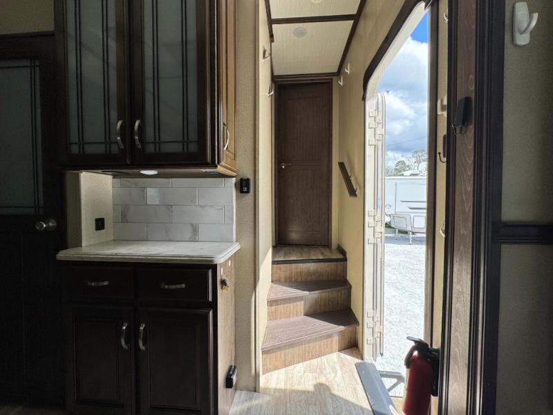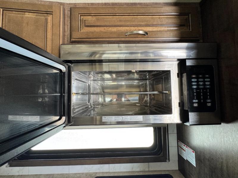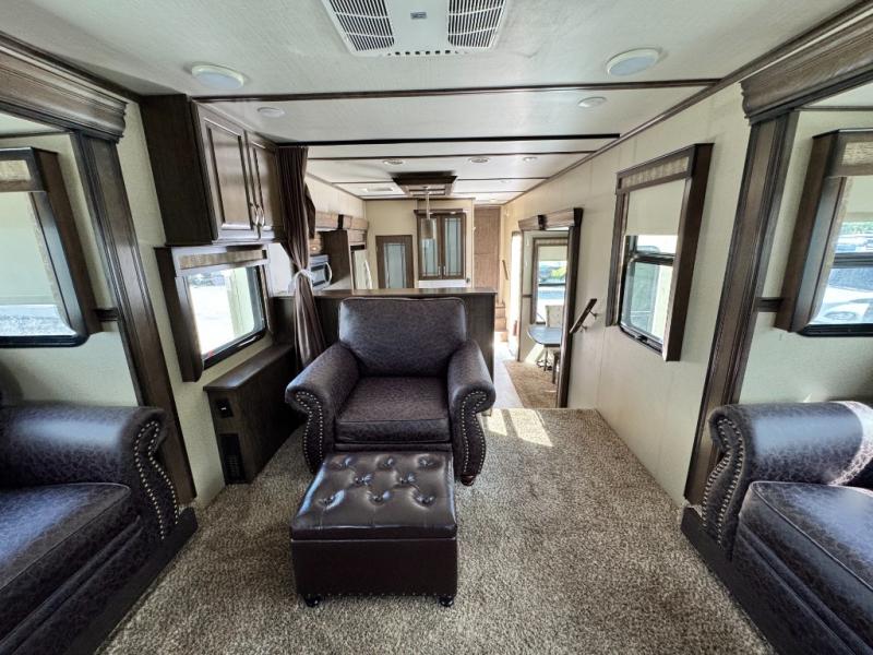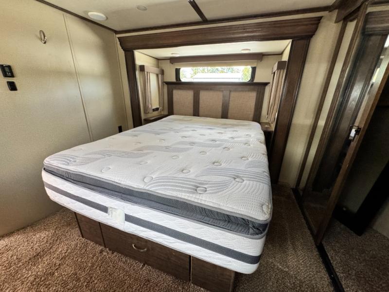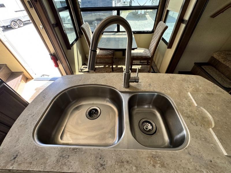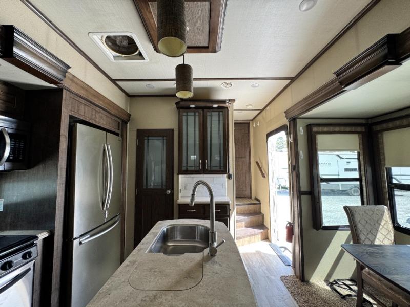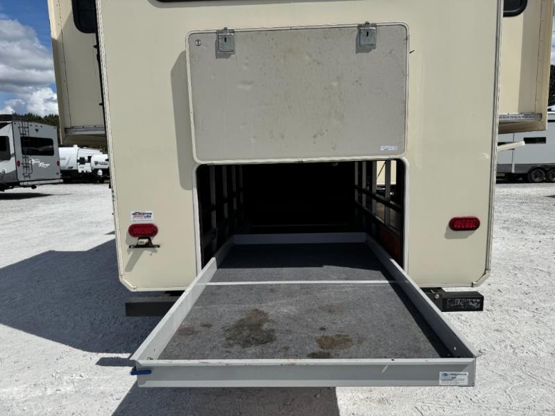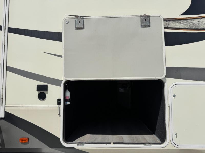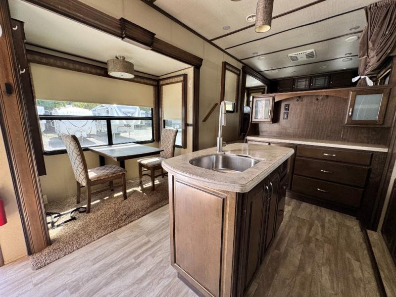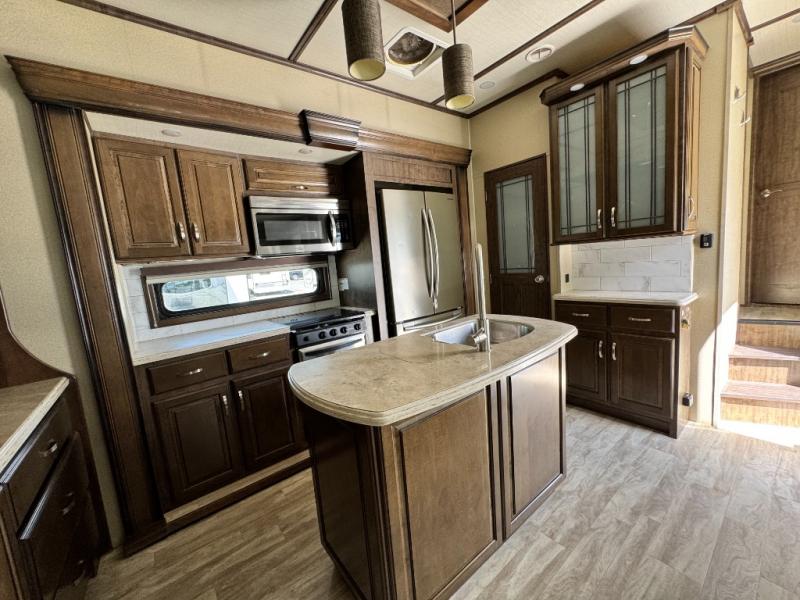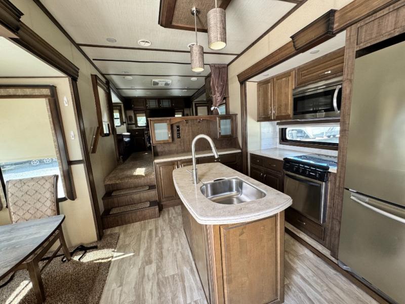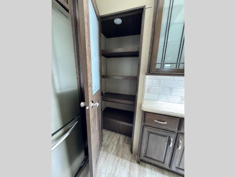 This Solitude 375RES fifth wheel allows you to travel with all the comforts of home including plenty of interior floor space to move around, extra sleeping space for the kids or grandkids, and plenty of storage for everything you might need for an extended stay. The unique exterior rear storage includes a sliding tray allowing easy access to the gear in the back. Inside, the front master bedroom will not disappoint with a pullout ottoman, flip-top dresser, and a TV to mention a few features. The cook will surely love making meals with the professional grade stainless steel cooktop, built-in oven and convection microwave. The popular kitchen island, stainless steel 18 cu. ft. four door refrigerator, and large pantry are sure to impress. The buffet adds additional counter space to serve food or place your keys and things. You might even decide to add a few options such as a washer and dryer to keep your clothes clean the whole time, a king size bed for more sleeping surface, or even a pull-out kitchen to make meals outdoors. There are many features and plenty of space for everyone!