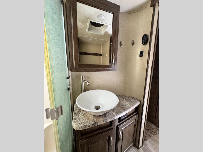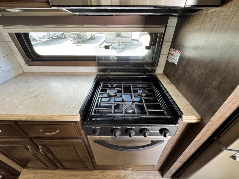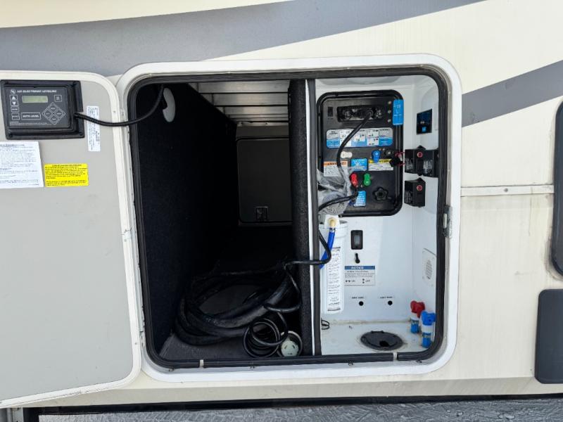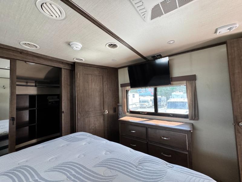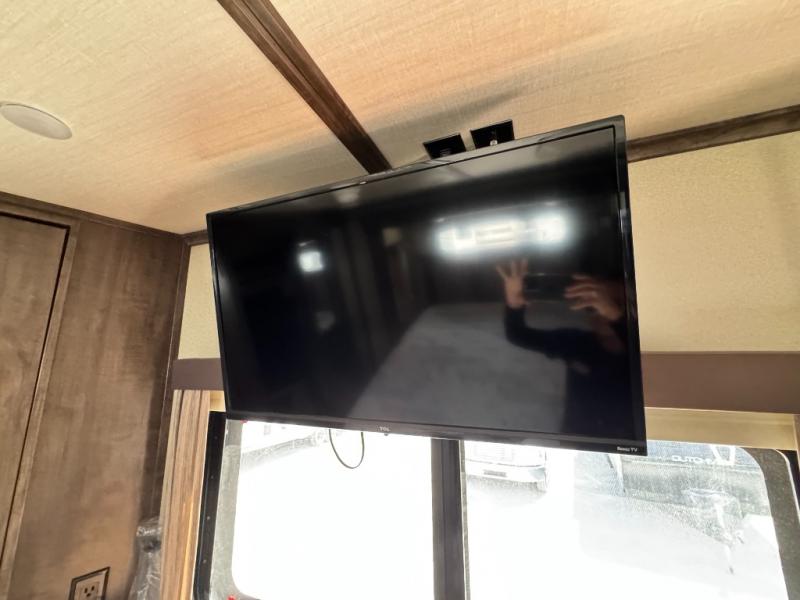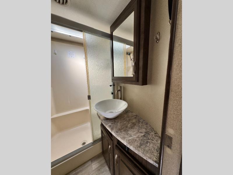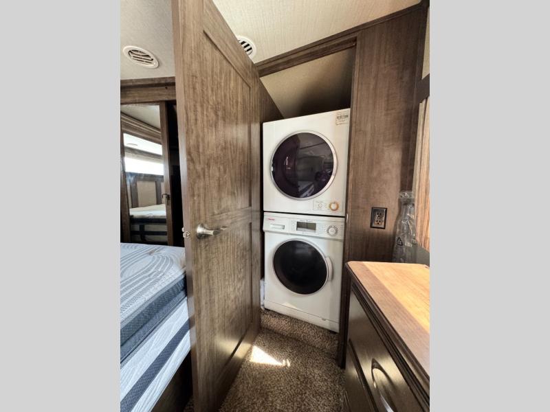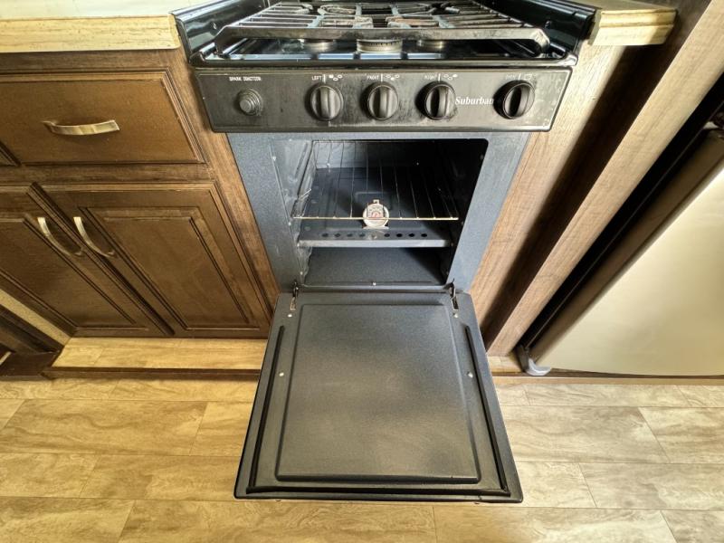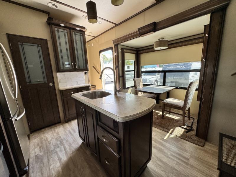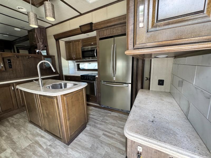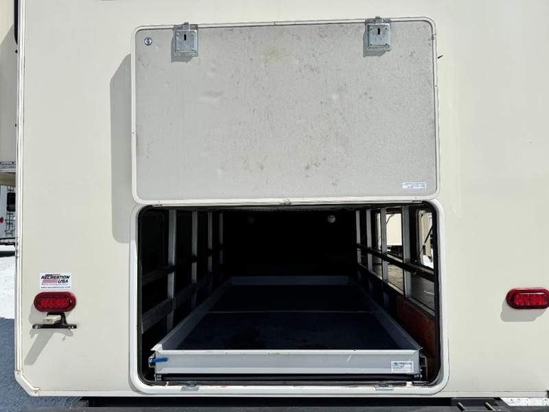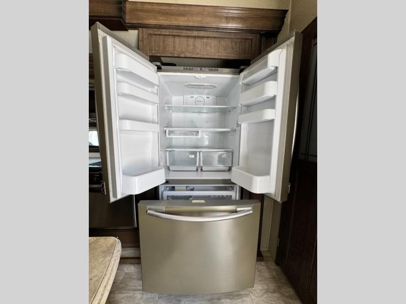 This Solitude 375RES fifth wheel allows you to travel with all the comforts of home including plenty of interior floor space to move around, extra sleeping space for the kids or grandkids, and plenty of storage for everything you might need for an extended stay. The unique exterior rear storage includes a sliding tray allowing easy access to the gear in the back. Inside, the front master bedroom will not disappoint with a pullout ottoman, flip-top dresser, and a TV to mention a few features. The cook will surely love making meals with the professional grade stainless steel cooktop, built-in oven and convection microwave. The popular kitchen island, stainless steel 18 cu. ft. four door refrigerator, and large pantry are sure to impress. The buffet adds additional counter space to serve food or place your keys and things. You might even decide to add a few options such as a washer and dryer to keep your clothes clean the whole time, a king size bed for more sleeping surface, or even a pull-out kitchen to make meals outdoors. There are many features and plenty of space for everyone!
