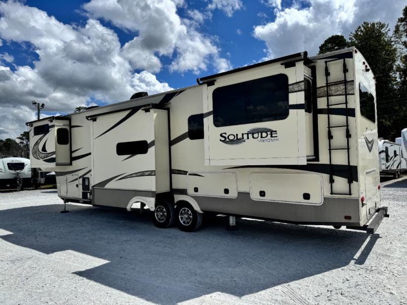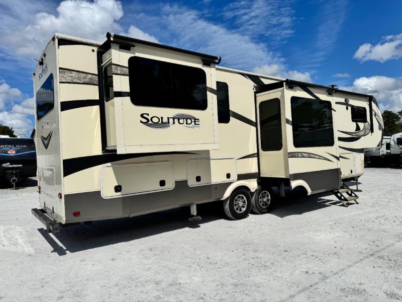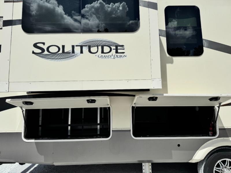 With each Solitude fifth wheel by Grand Design you will receive affordable luxury for your extended stays or weekend get-a-ways. From the solid foundation including a Equa-Flex suspension to the taller ceilings, taller and deeper cabinets, the power reclining theatre seating with swivel table including a heat and massage function, a pet dish drawer, a Stealth AC system, and the Weather-Tek package which allows you to travel any season you choose. It's time to enjoy luxury living where ever you decide to land.