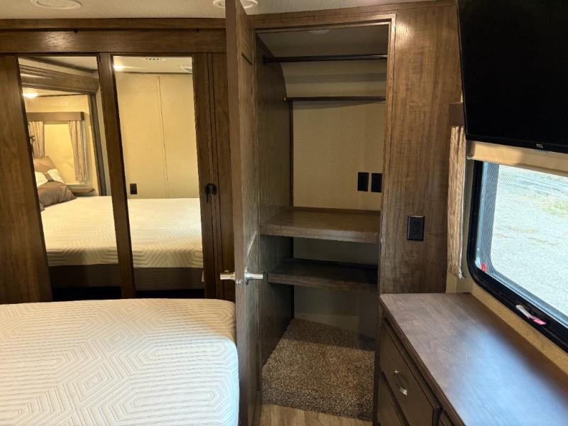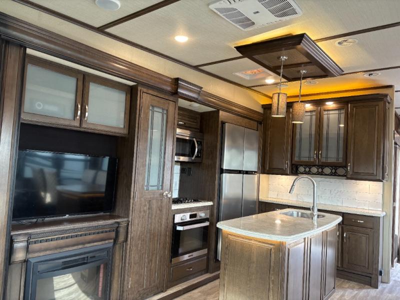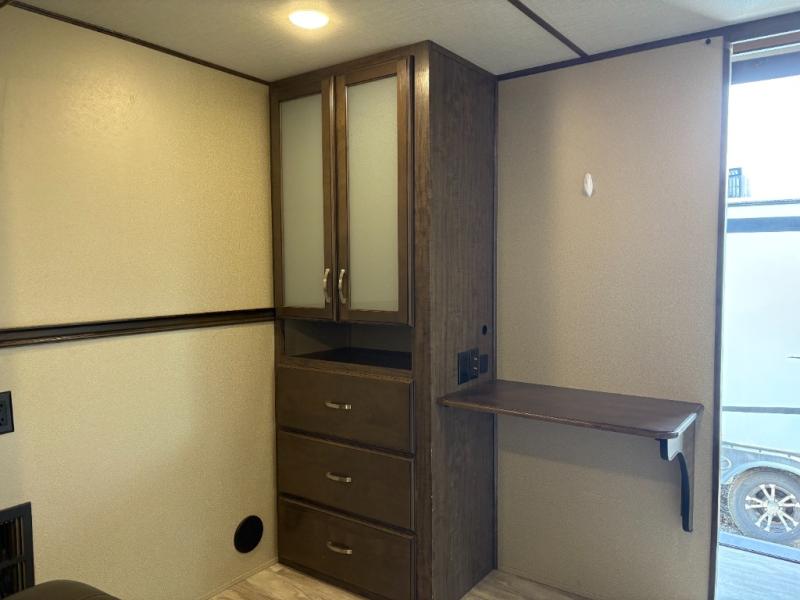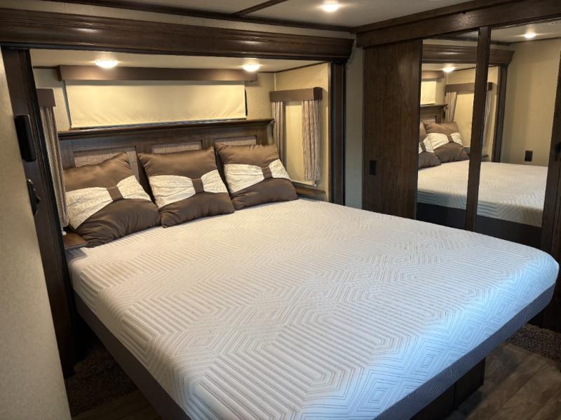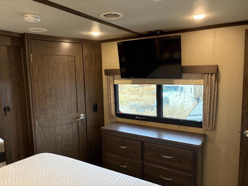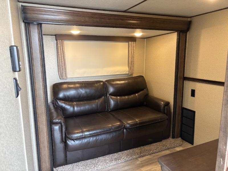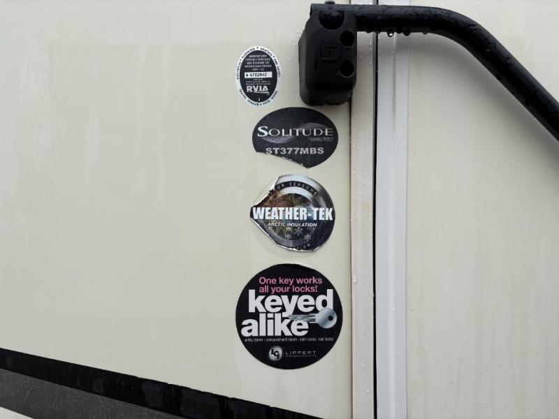 If you have been searching for a fifth wheel with an extra living room that can be utilized as an office or even a bedroom then look no further, this Solitude 377MBS fifth wheel may complete your checklist. The extra living room provides a desk, storage, and a seating area, plus a loft above for even more sleeping space. The front master bedroom provides the perfect bedding, storage for all your clothing, and a TV, plus more! The cook will surely love making meals with the professional grade stainless steel cooktop, built-in oven and convection microwave. The popular kitchen island, stainless steel 18 cu. ft. four door refrigerator, and large pantry allow you to stock up on food and wash dishes while visiting with your guests. The buffet adds additional counter space to serve food or place your keys and things. You might even decide to add a few options such as a washer and dryer to keep your clothes clean the whole time, a king size bed for more sleeping surface, or even a pull-out kitchen to make meals outdoors. There are many features and plenty of space for everyone!