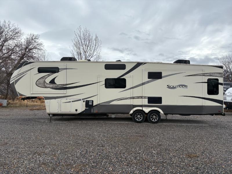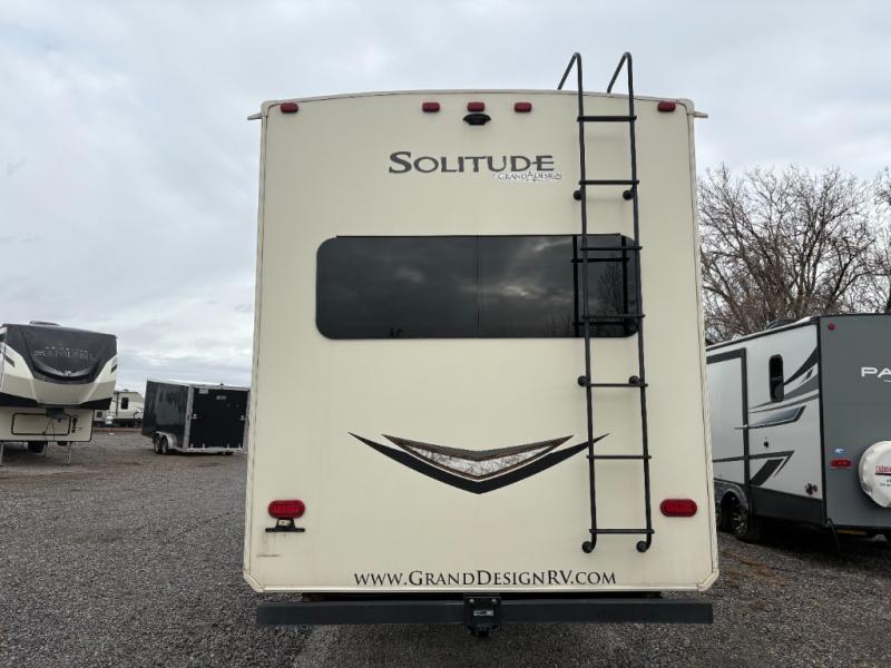 With each Solitude fifth wheel by Grand Design you will receive affordable luxury for your extended stays or weekend get-a-ways. From the solid foundation including a Equa-Flex suspension to the taller ceilings, taller and deeper cabinets, the power reclining theatre seating with swivel table including a heat and massage function, a pet dish drawer, a Stealth AC system, and the Weather-Tek package which allows you to travel any season you choose. It's time to enjoy luxury living where ever you decide to land.