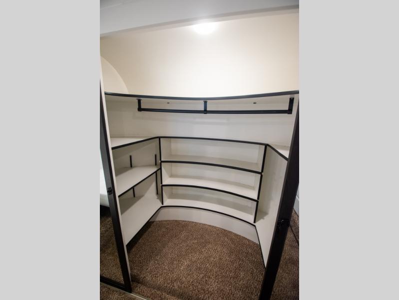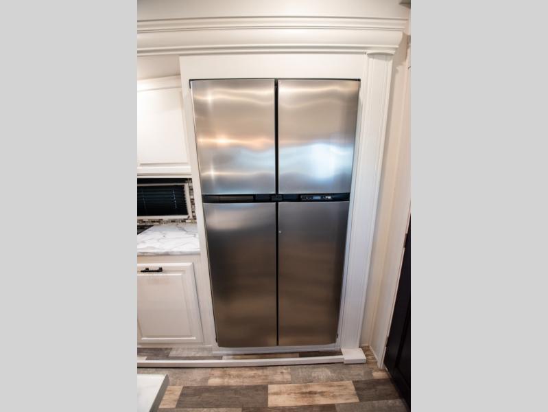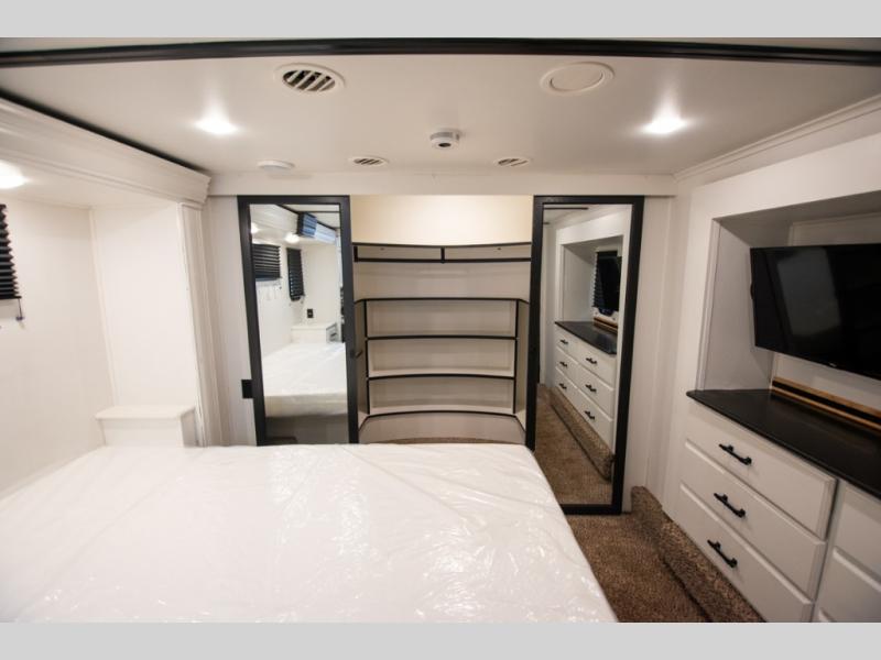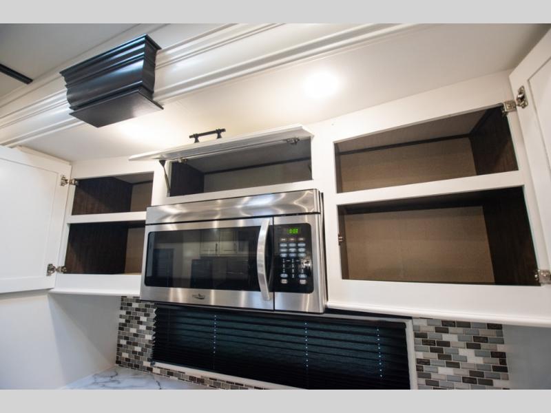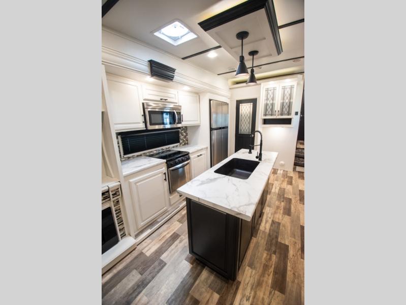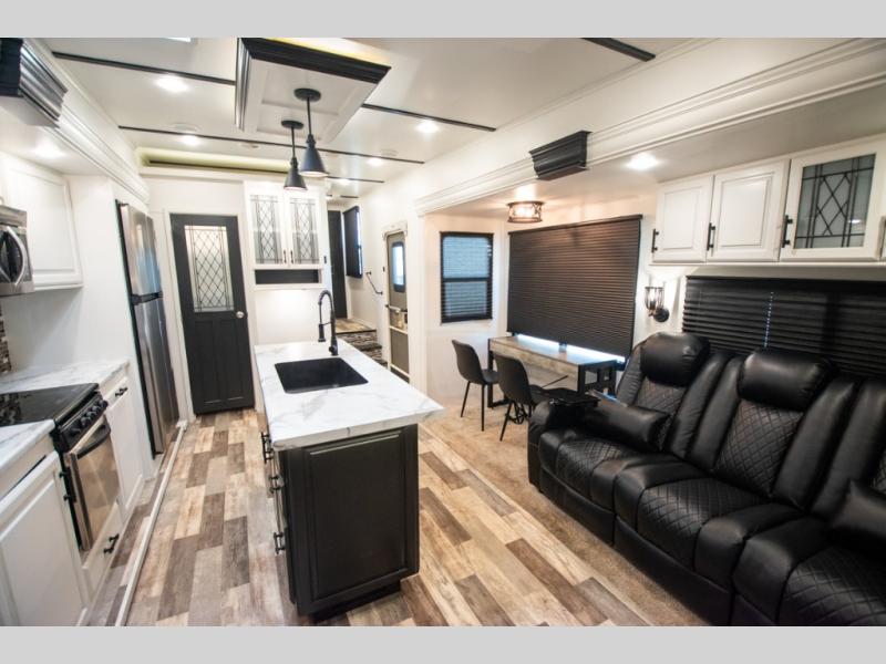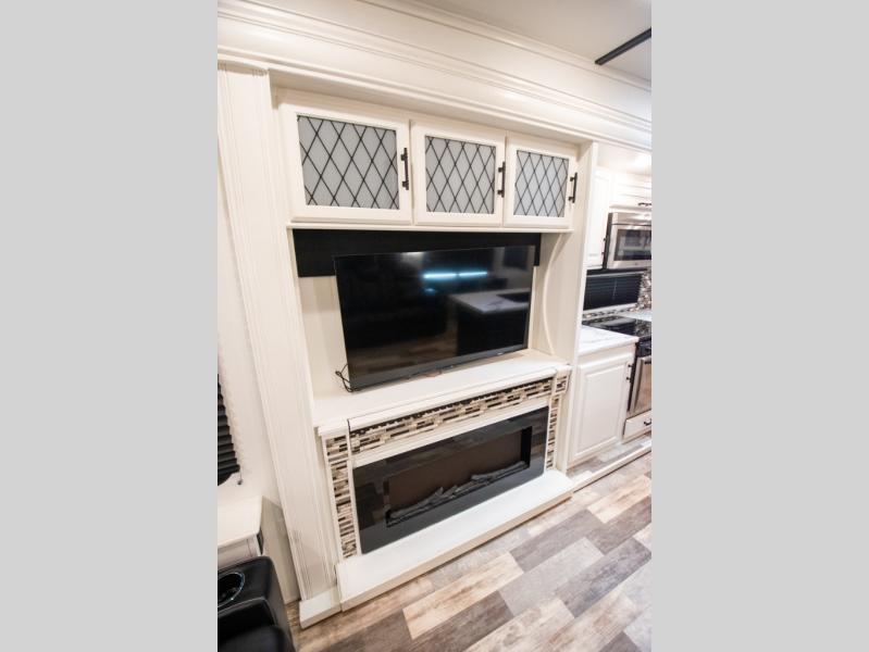 If you have been searching for a livable fifth wheel, this Solitude 384GK might be the one! Just imagine making breakfast with the professional grade stainless steel cooktop and convection microwave. You might even prepare and serve the food on the kitchen island, and store leftovers in the stainless steel 18 cu. ft. four door refrigerator. When you and your spouse aren't exploring outside, you can work at the desk, or watch your favorite show on the big screen LED TV in the living area while staying warm by the fireplace. You will find plenty of storage throughout including for your shoes, dry goods, linens, and your wardrobe. You might even decide to add a washer and dryer, a dishwasher, and a pull-out kitchen outside. Come sit in this Solitude to see how comfortable you will be!