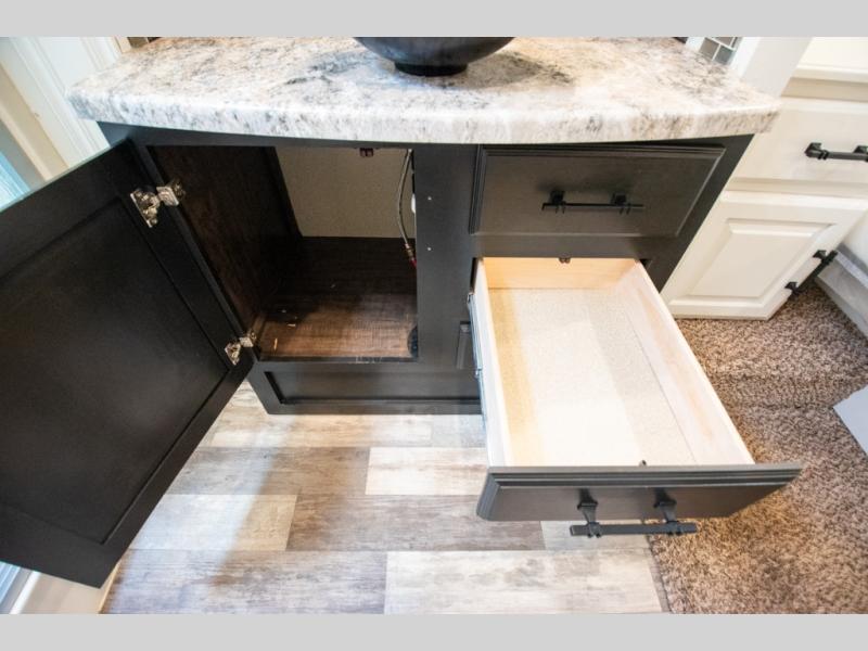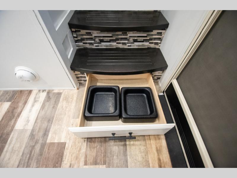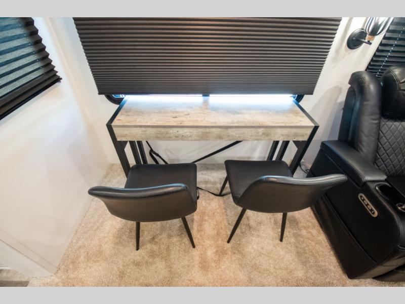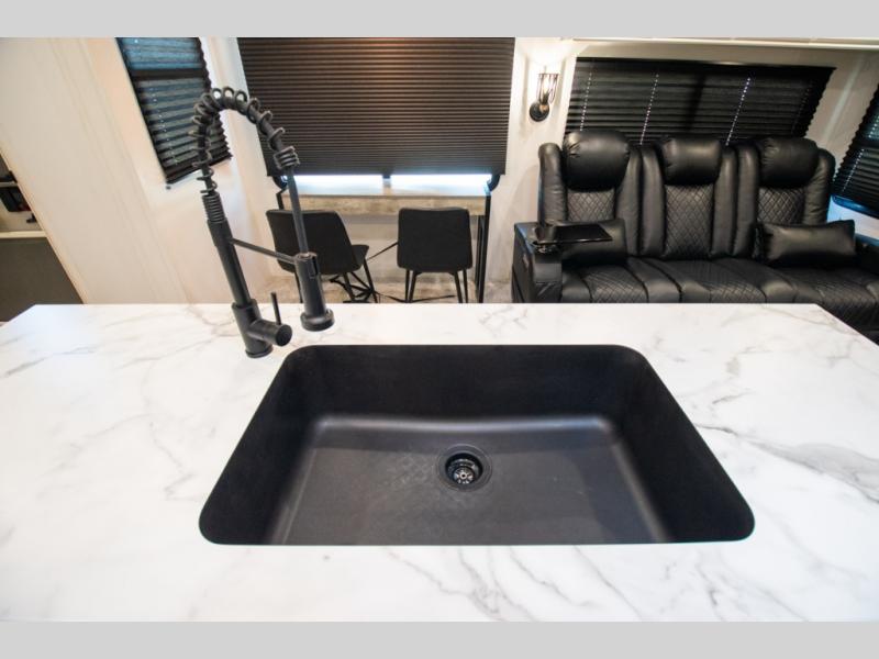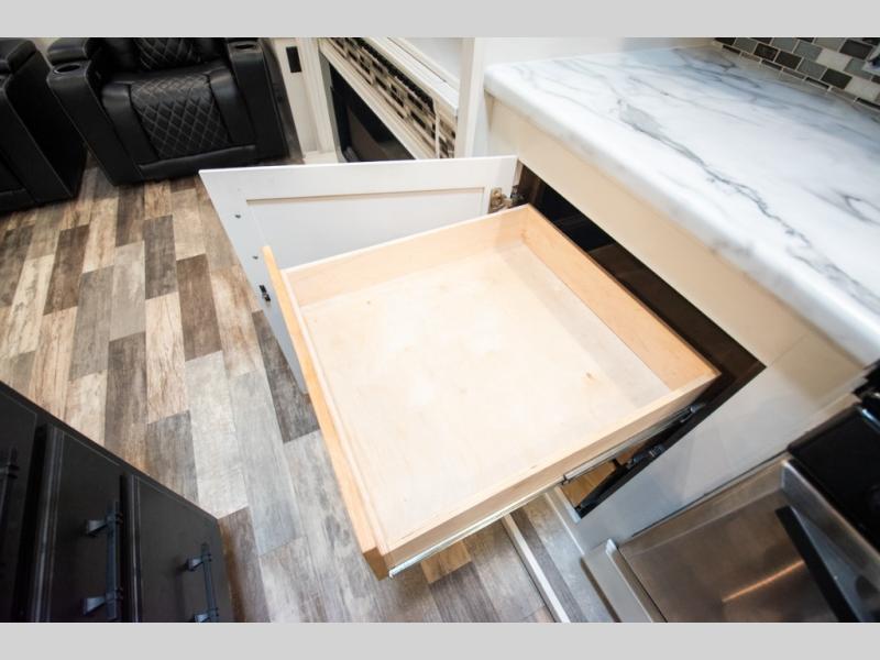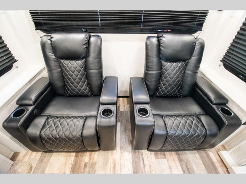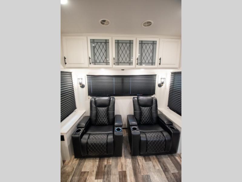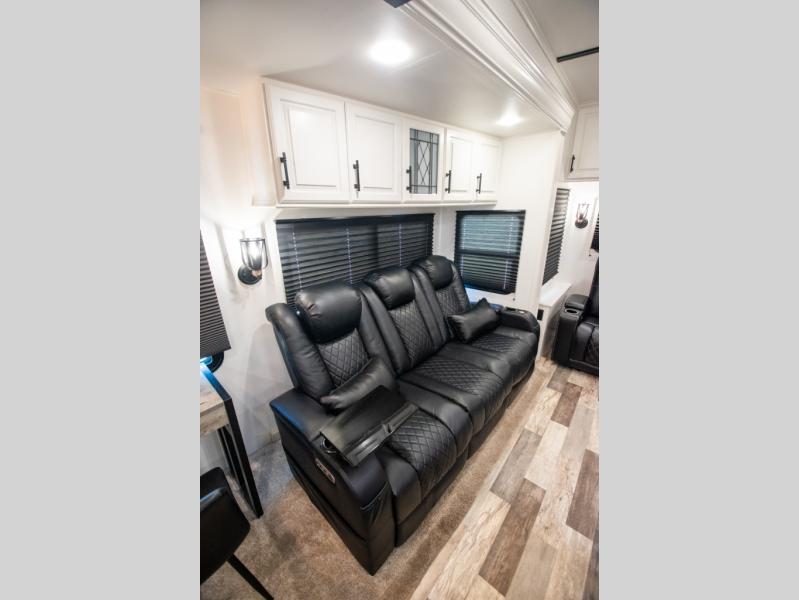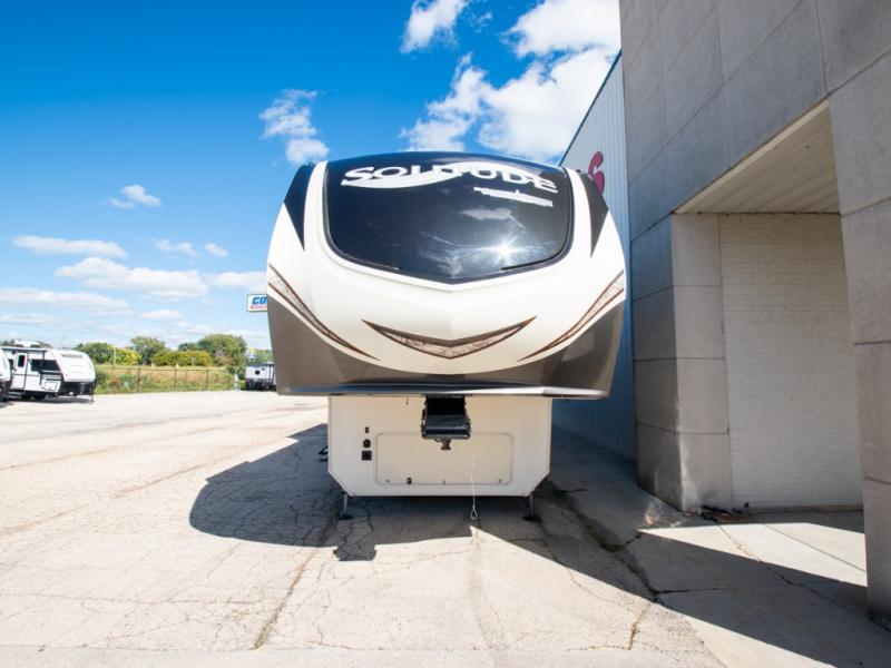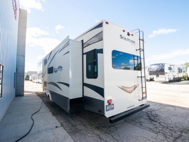 With each Solitude fifth wheel by Grand Design you will receive affordable luxury for your extended stays or weekend get-a-ways. From the solid foundation including a Equa-Flex suspension to the taller ceilings, taller and deeper cabinets, the power reclining theatre seating with swivel table including a heat and massage function, a pet dish drawer, a Stealth AC system, and the Weather-Tek package which allows you to travel any season you choose. It's time to enjoy luxury living where ever you decide to land.