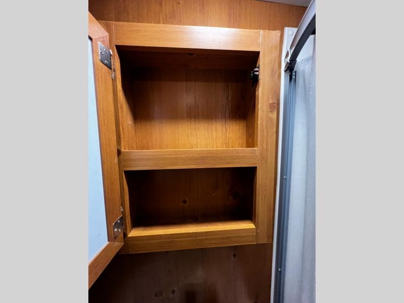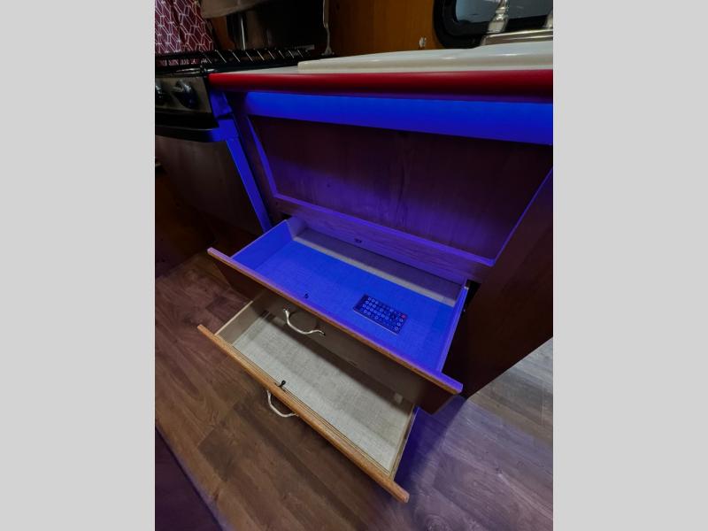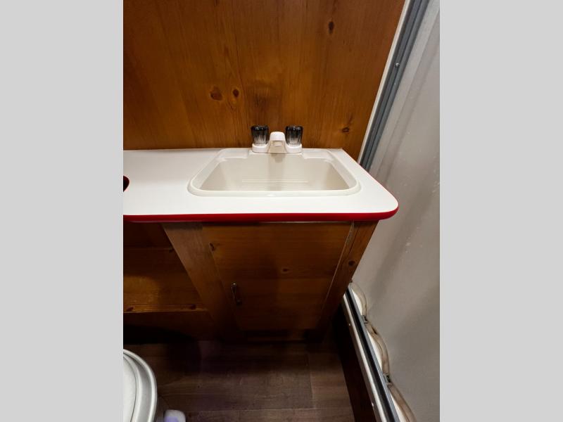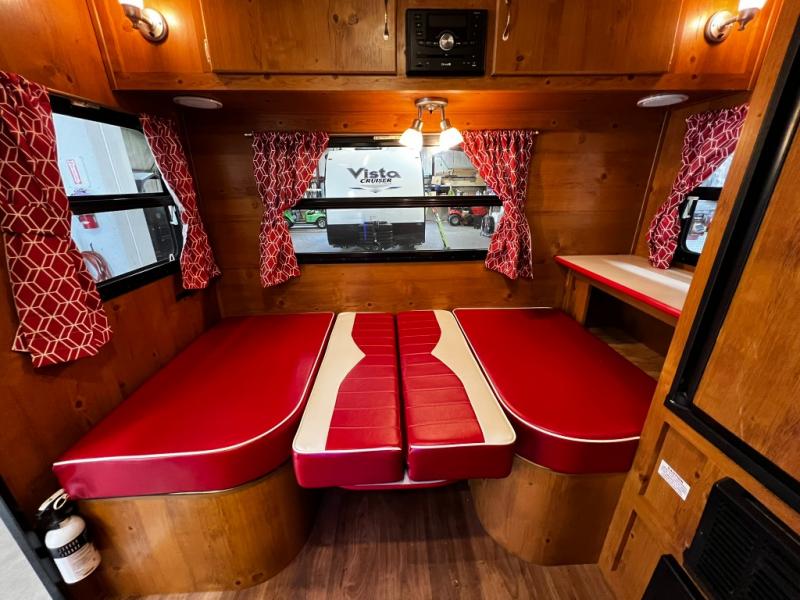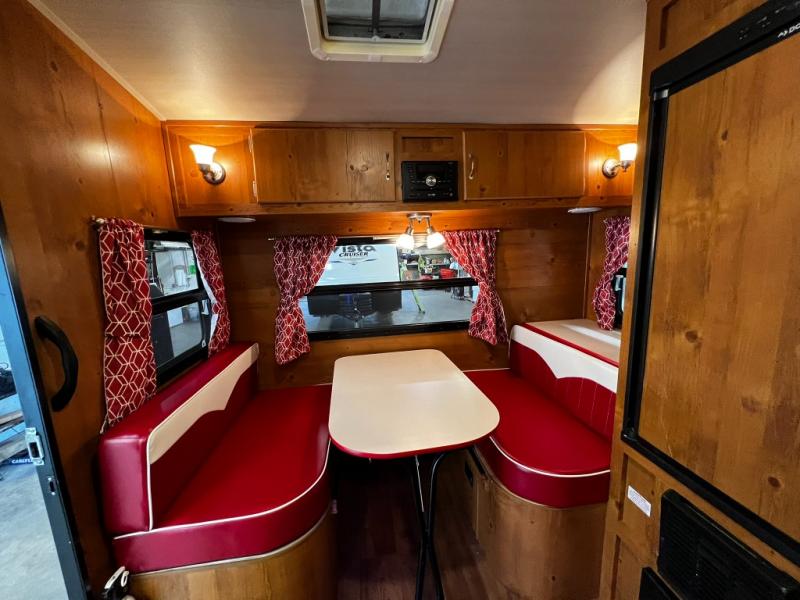 You will love the rear dinette with retro-style upholstery inside this cute Vintage Cruiser model 17RWD. Here you can enjoy your daily meals, a game of cards, or just sit and sip a great cup of coffee and enjoy the view through the windows on all three sides. The front corner bed, on the opposite end, offers a cozy nights sleep for two when night falls, and the dinette can also be transformed into another bed if needed for a third adult or a couple of kiddos. You will find plenty of storage throughout in overhead cabinets, cupboards, and drawers. The bath even features linen storage beneath the washstand, plus so much more!