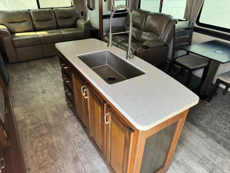 With this Elkridge fifth wheel you can confidently vacation anywhere knowing that all of your needs will always be met. The private bedroom will be a wonderful escape at the end of each day with its king-size slide-out bed, and the walk-in closet adds extra available space to store all of your favorite sweatshirts and blue jeans. Because of the two opposing slides in the main living area, you will love gathering together with the family as you prepare dinner in the kitchen or as you relax after dinner on the theater seats with heat and massage capabilities.