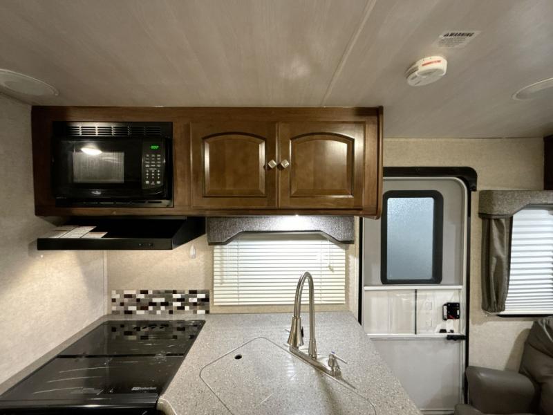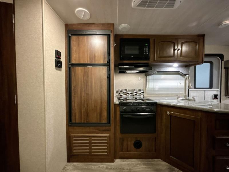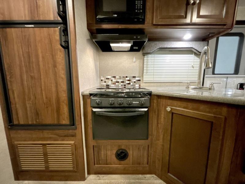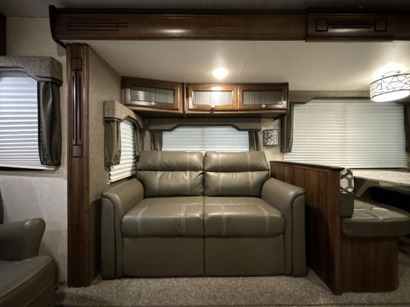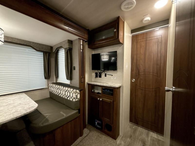 As you continue moving through this unit you will see a slide out sofa with overhead storage and booth dinette. The perfect place to enjoy meal time, board games, or just hanging out.