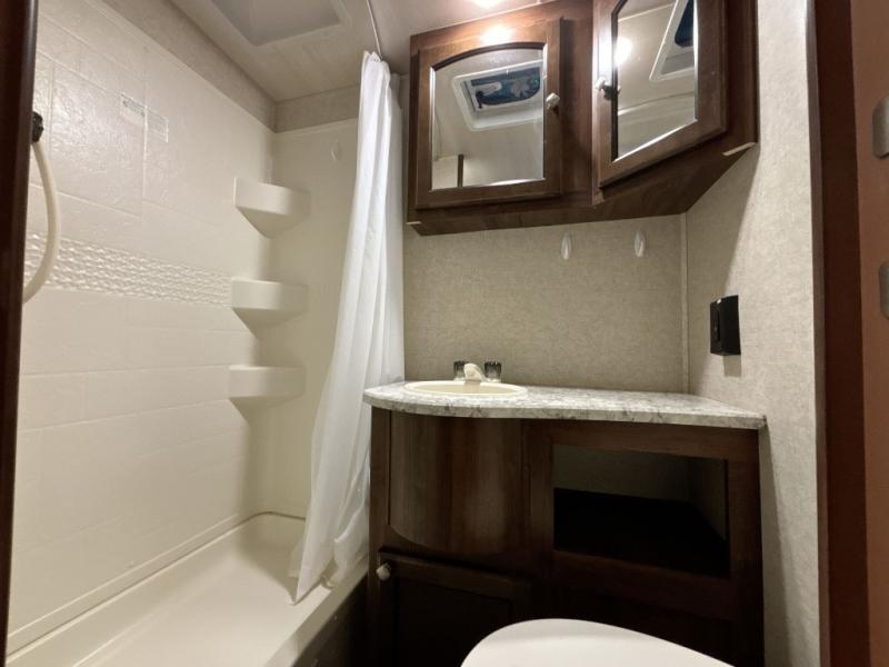 The bath features a tub/shower, toilet, and a sink. There is also an entertainment center with storage along the opposite wall of the bath near the dinette slide. You can add an optional TV if you like.