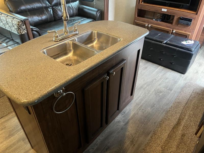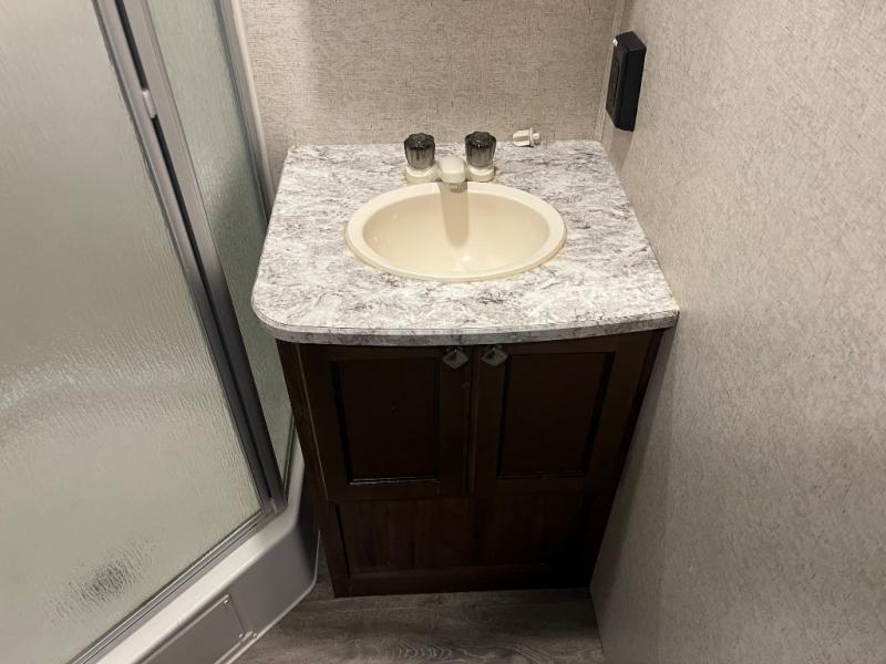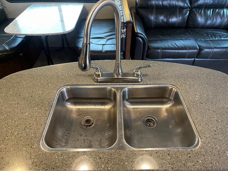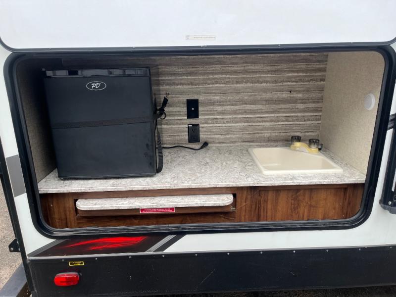 This 27RBDS North Trail King travel trailer by Heartland RV has everything you need to enjoy your time away from home. There are double slide outs in the main living area for the maximum amount of floor space. The island with a double sink is also a nice area to prepare meals or you can easily clean up here. In the front bedroom there is a queen bed plus extra storage space with the overhead cabinet and wardrobes. If you choose to add the optional TV then you can enjoy watching a little TV in bed thanks to the swivel entertainment center. When the weather is nice then come prepare your meals outside since there is an outside kitchen plus you can easily grill out with the bumper mount grill!