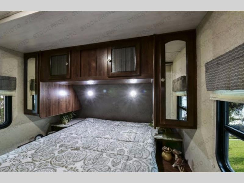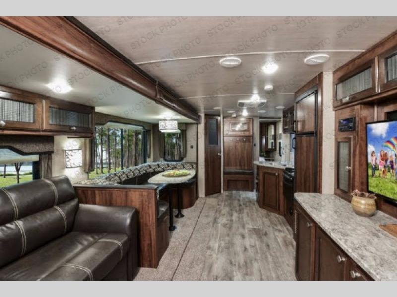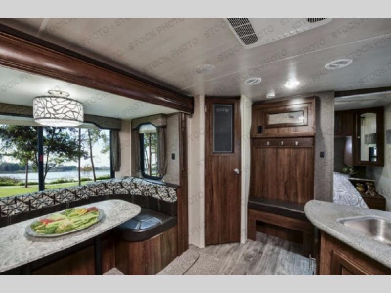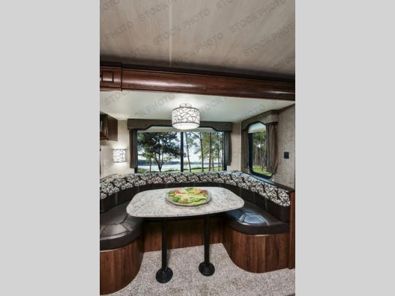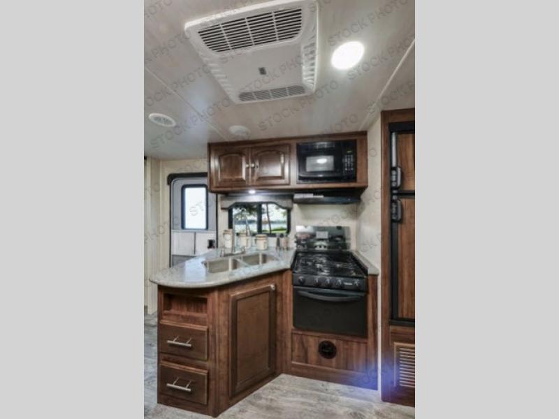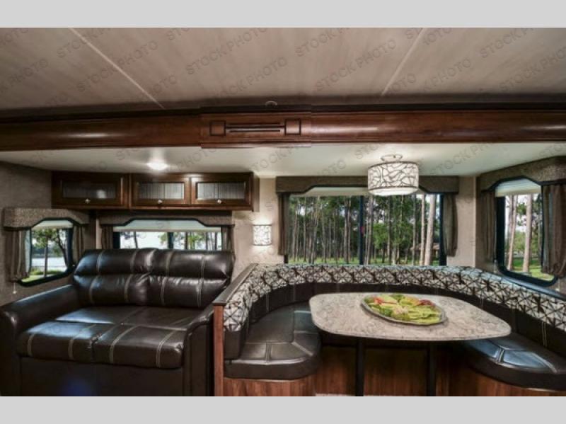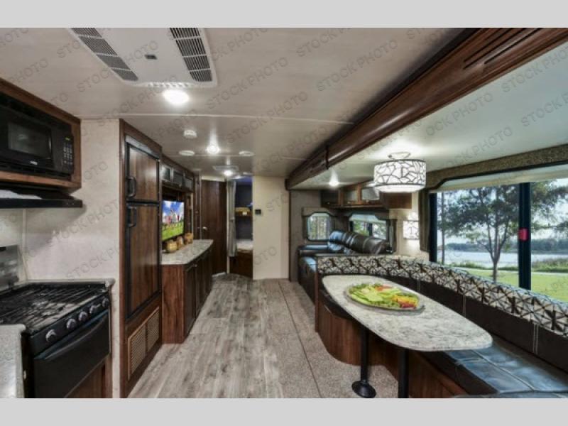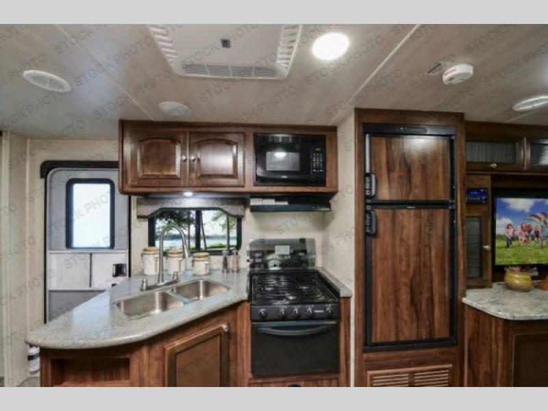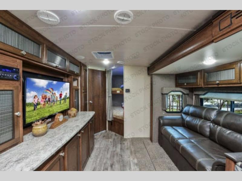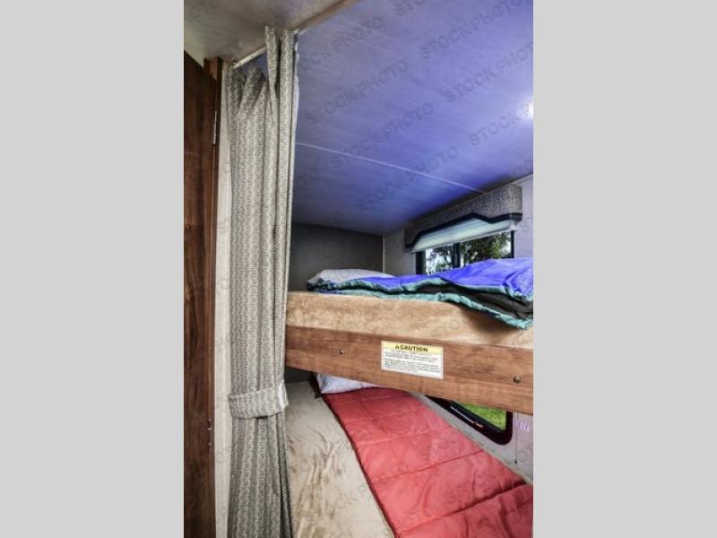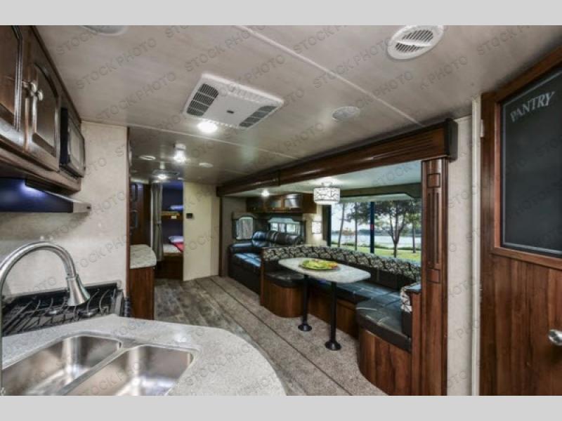 This camping season come choose to camp in this single slide out 31BHDD North Trail travel trailer! It is easier than ever to camp with your whole family or even a few friends since there is a set of double bunk beds in the rear. Enjoy your meals at the u-dinette and at night this area can convert into additional sleeping space. Mom and dad can retreat to the private front bedroom where there is a queen bed. You will find that this model has two entry doors - the front door leads into the combined kitchen/living area, and the rear door leads into the bathroom so you can easily access the bathroom from outside. With the outside kitchen you can easily prepare your dinner or lunch while watching your kids play! This North Trail travel trailer is also available in a Caliber Edition.