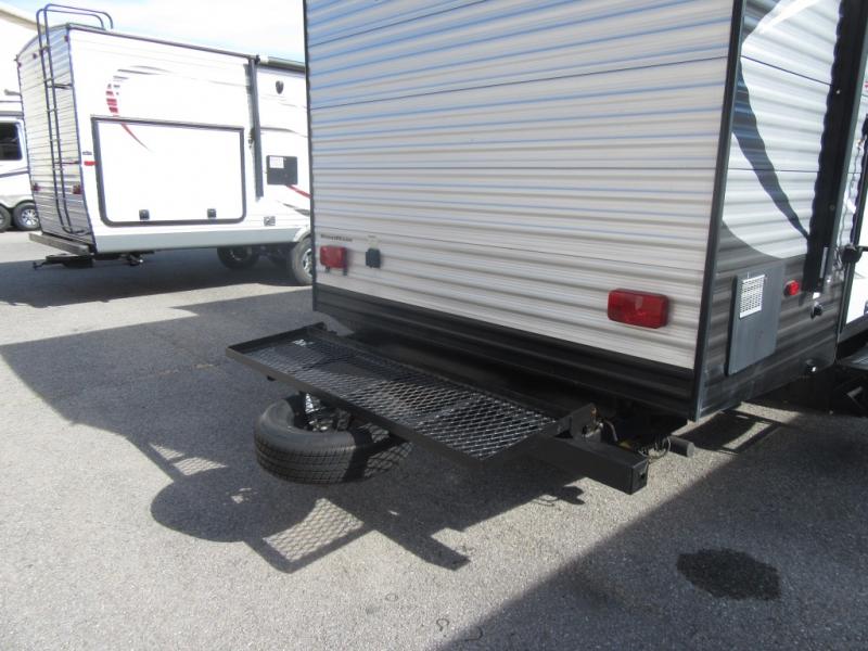 As you journey across the country and search for your absolute favorite getaway spots, you will find that the thing you love most about camping is this trailer by Heartland. From the tinted safety glass windows, which will prevent the sun's harmful rays from damaging the interior furnishings, to the LED-lit exterior speakers, which will draw your family outdoors each evening to enjoy the pleasant music they can play, this unit delivers it all. When you do head inside, you will be pleasantly surprised to find vaulted ceilings that will keep the space feeling open and roomy, and you will always be able to confidently travel in this unit because of all of the safety equipment that has been included to prevent unseen emergencies, like the fire extinguisher and the smoke, carbon monoxide, and LP detectors.