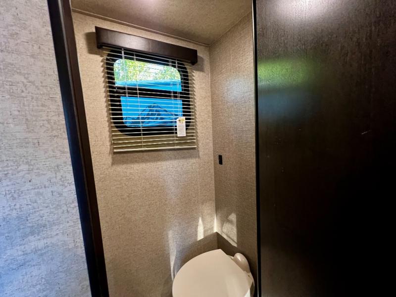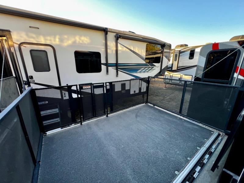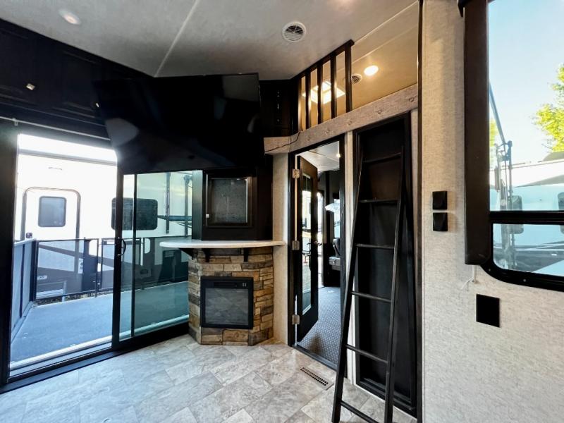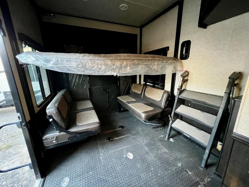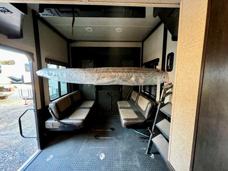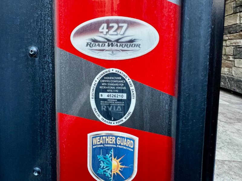 When you are ready for your next vacation to include time outdoors riding the trails and then coming back to the comfort of your home away from home, you will want this double slide out Road Warrior 427 toy hauler! The 12.5' garage has enough room for a few dirt bikes or even an ATV. With the half bathroom in the garage you can easily clean up before heading inside. After dinner come enjoy sitting outside at the patio while watching a little TV at the optional exterior 40" TV. Your kids can have their own space up in the loft, and mom and dad can enjoy the spacious master bedroom with a king bed!