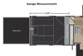 In the 11' garage (see photo for exact details) you will find storage cabinets, an electric queen bed with split bench seat/bed option, side man door, and rear ramp door, plus so much more!