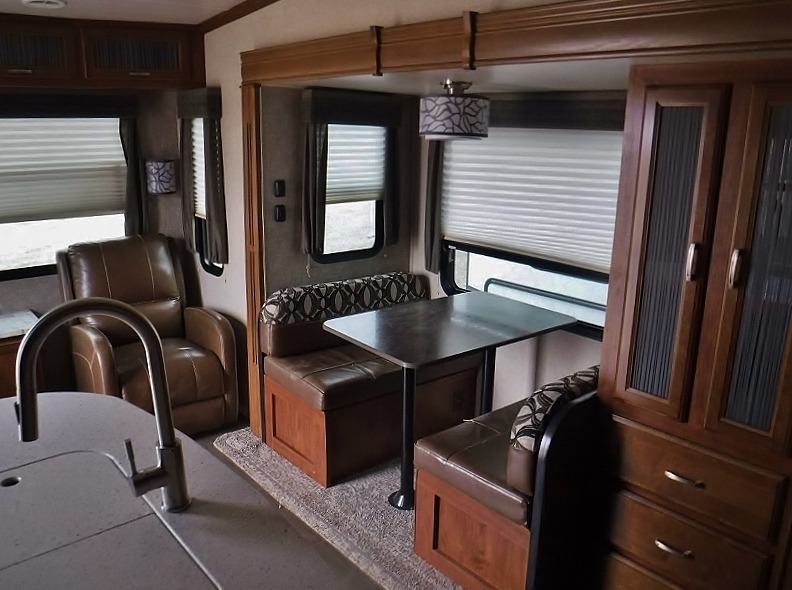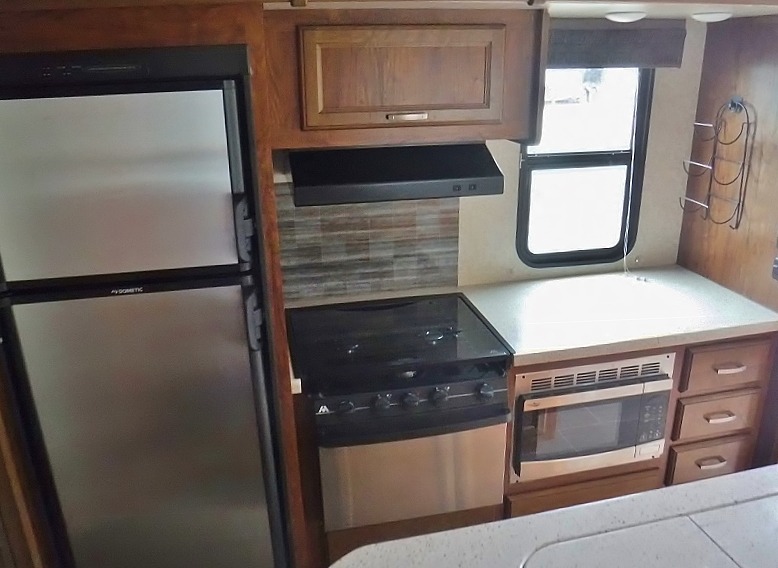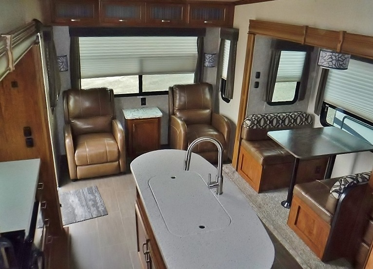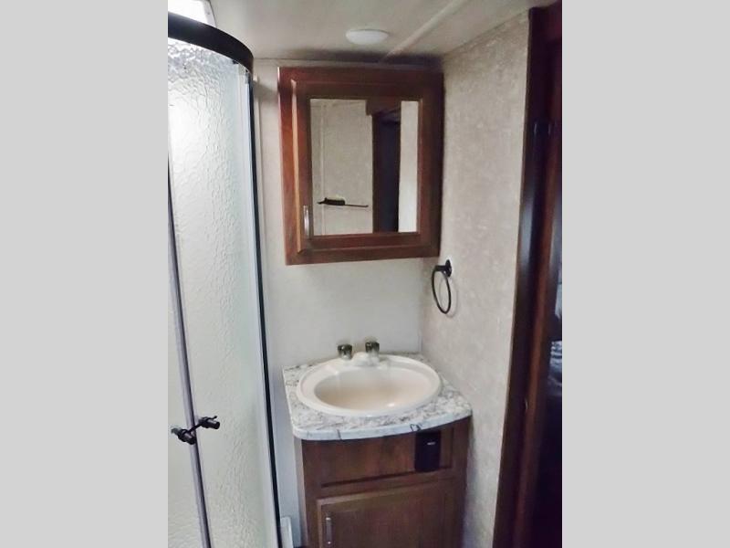 This Sundance mid-profile fifth wheel is a great couples coach which provides a roomy interior that you are sure to enjoy. The triple slides are all flush mounted slides so there is no bump on the floor to trip over when your slides are fully extended. You will enjoy a complete kitchen including a handy island where your sink is located, and stainless steel appliances as well. There is plenty of storage throughout with a large closet in the master bedroom, a pantry, plus overhead cabinets in the kitchen area as well as across the entire rear of the unit making it easy to keep things tucked away when not in use.
