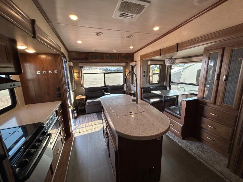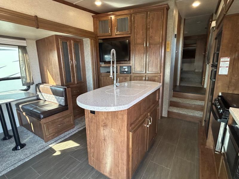 This Sundance mid-profile fifth wheel is a great couples coach which provides a roomy interior that you are sure to enjoy. The triple slides are all flush mounted slides so there is no bump on the floor to trip over when your slides are fully extended. You will enjoy a complete kitchen including a handy island where your sink is located, and stainless steel appliances as well. There is plenty of storage throughout with a large closet in the master bedroom, a pantry, plus overhead cabinets in the kitchen area as well as across the entire rear of the unit making it easy to keep things tucked away when not in use.
