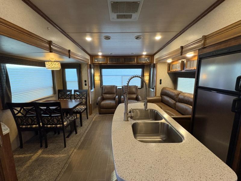 You are going to love the open concept feel of this Sundance fifth wheel by Heartland RV with its triple flush floor slide outs. Model 289TS features dual opposing slides in the main combined kitchen and living area which offers a tri-fold sofa and two recliners for seating besides the free standing table and chairs for dining. The kitchen area offers stainless steel appliances and ample counter space plus storage with a separate island including dual sinks. The private bedroom and bath will help keep you clean and refreshed all while you are enjoying new surroundings for a weekend or week long adventure.