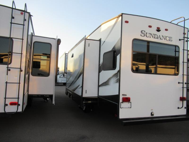 Get ready to head out for a much needed break from work with your very own Full-Profile Heartland Sundance fifth wheel! Each model features a painted fiberglass front cap. You will appreciate the universal docking center and Mor/Ryde suspension for easy hook-up and smooth towing! Once you are parked and set up, you will enjoy a very functional and comfortable interior with luxuries like stainless steel appliances, LED interior lighting, flush floor slides, and so much more. Choose Sundance for your next outdoor adventure!