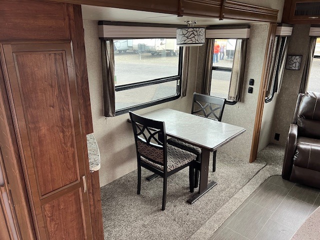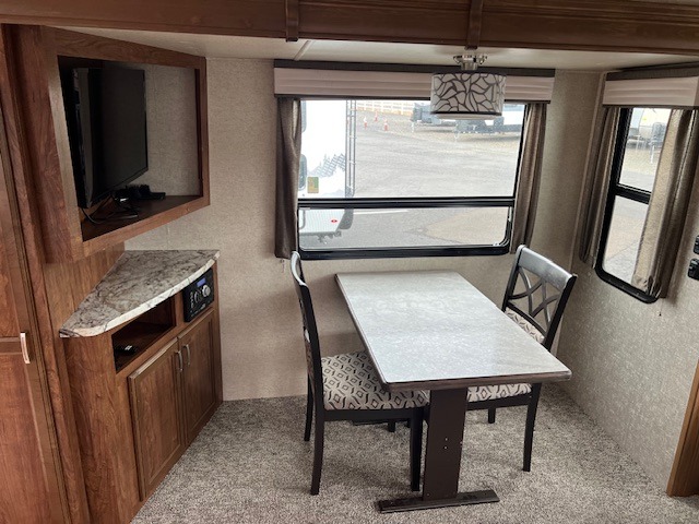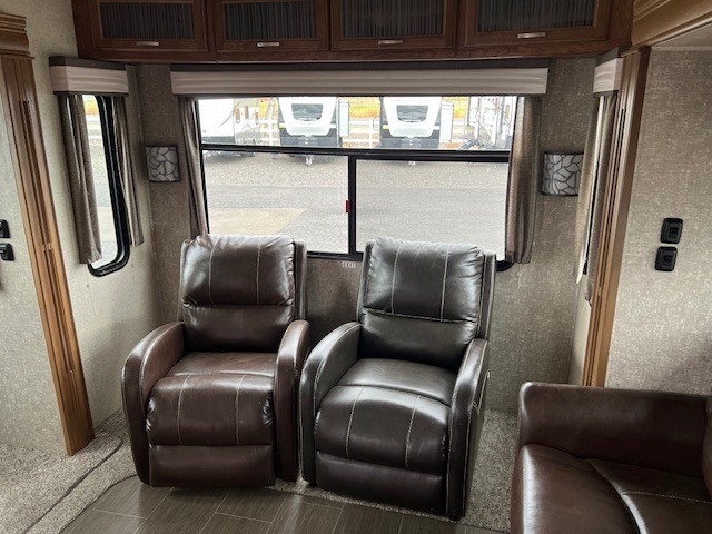 Step inside and notice the open concept living space with the dual opposing slides fully expanded. There is a corner storage/entertainment center and free standing dining table for four in the slide to your immediate left. Across the rear wall you will find two lounge chairs and a bit of storage in upper cabinets that stretch the entire width of the unit.