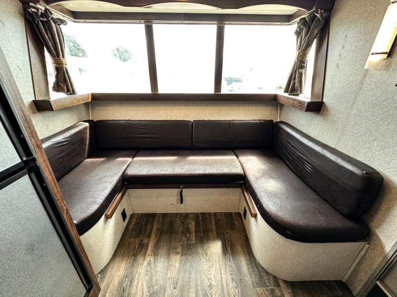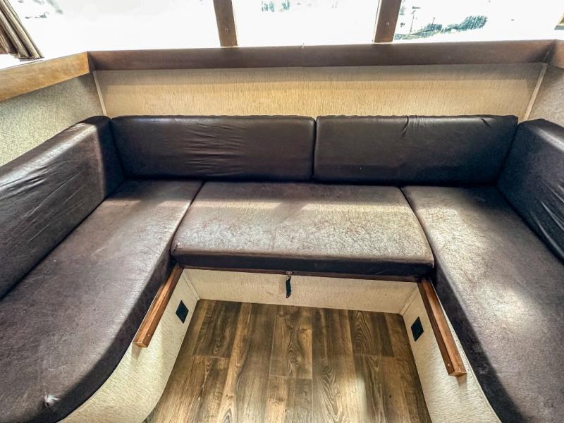 Get ready to turn heads when you pull into the campground with this vintage style Terry Classic V21 travel trailer by Heartland RV. Enjoy your meals around the u-dinette and at night this area doubles as more sleeping space. From the dinette you can easily see the 32” LED TV which is located along the interior wall. In the kitchen there are stainless steel appliances which include a refrigerator, two burner range, and microwave. For added ambiance you will enjoy the LED ceiling lights with cove surround blue accent lights. The rear queen tilt bed allows you to find that perfect sleeping position, or maybe you want to read before going to sleep, now you can easily do so.