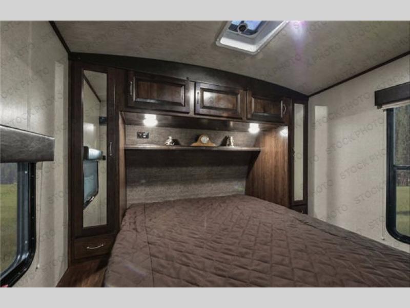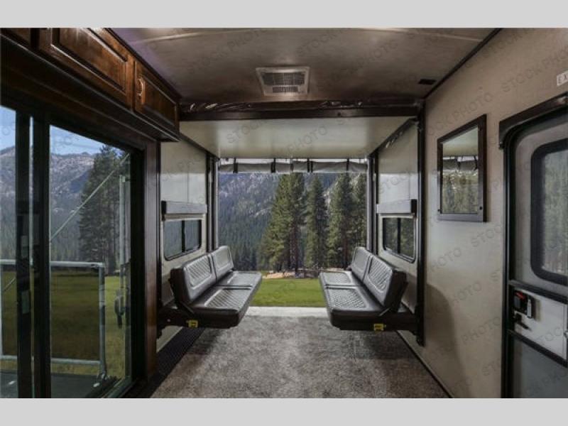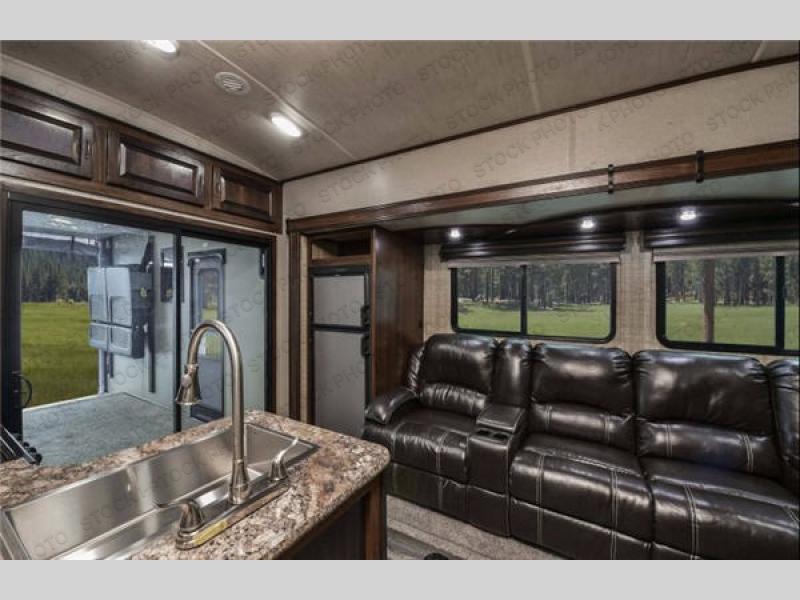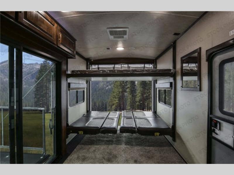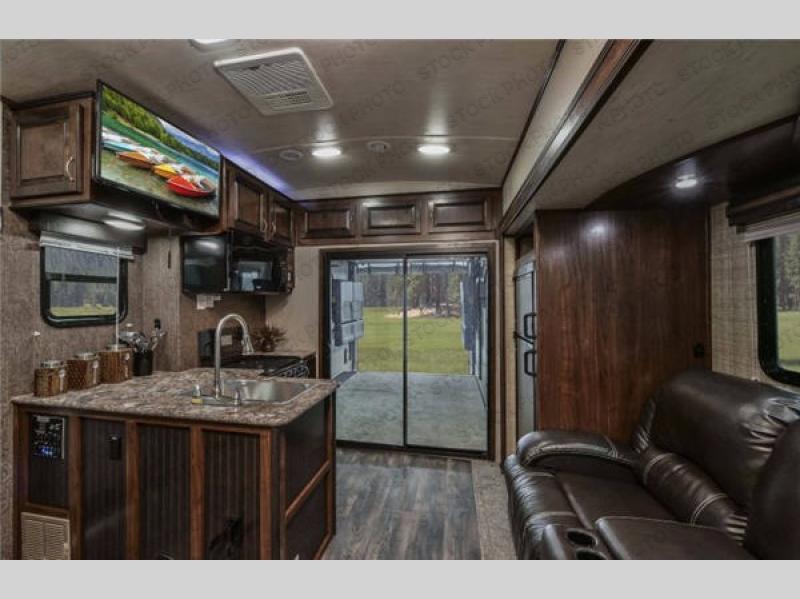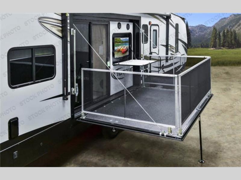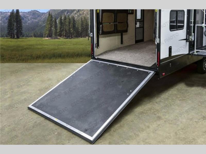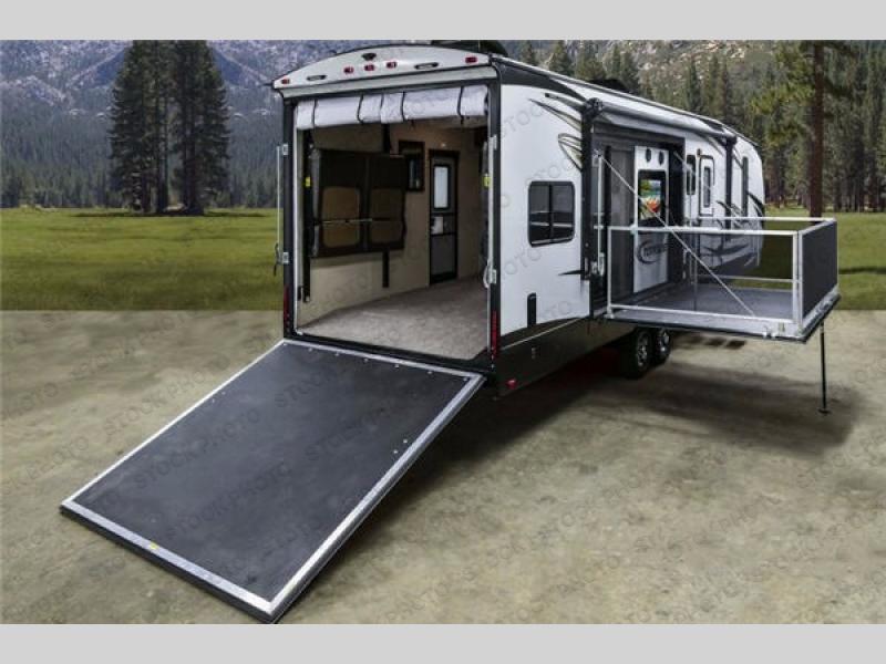This toy hauler travel trailer is one of the coolest units you will take a look at. There is 12' 1/2" of separate garage space for your toys, so you can choose to store them while you are parked or you can unload them and use the space for the electric queen bed and dual opposing sofas below. You can sleep up to eight people comfortably if you want I am sure you could even add a blowup mattress or two if you need more sleeping space. Take the party outside! There is a patio so you put up some folding chairs, hang out outside, enjoy the great outdoors, all without trampling dirt inside.