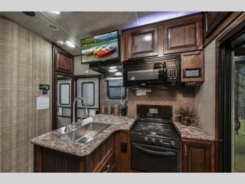 Get ready to have plenty of fun that will last all weekend long with any of the Heartland Torque toy hauler travel trailers. You can easily fuel up your toys at the outside fuel station. In the garage, you will find that the rubberized floor is fuel and oil resistant. In the kitchen, there are solid surface countertops and a high rise kitchen pull-out faucet. You can relax at the residential furniture with built-in recliners, and throughout each model, there is high end Ashlyn cabinetry as well as high-end carpet and cold/crack resistant flooring.