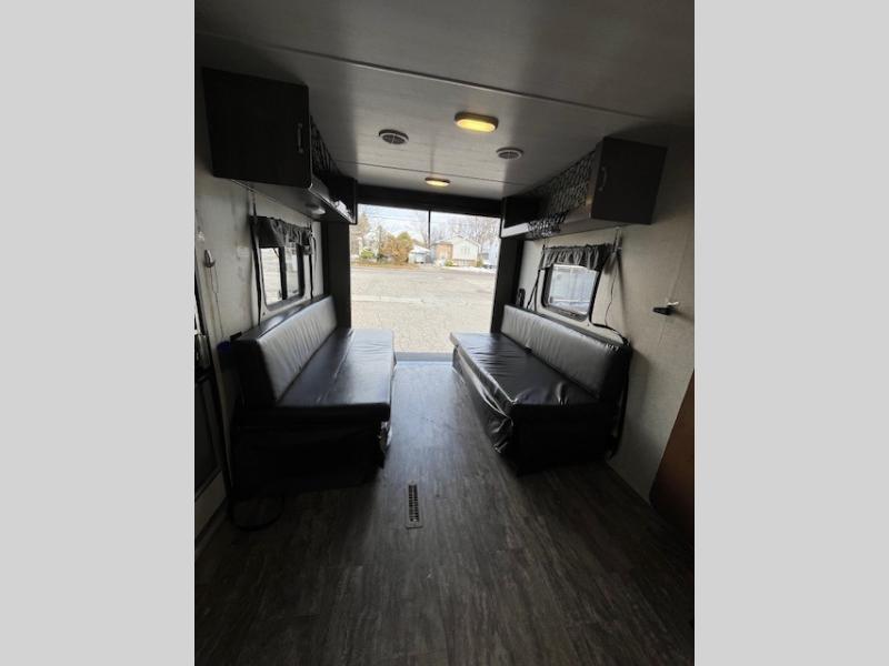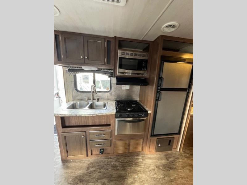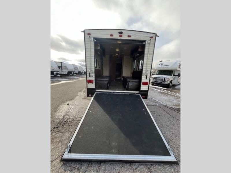 Load up your dirt bikes or a four wheeler, your family, and head on out to the outdoor playground of your choice with this Trail Runner 28TH toy hauler. You will find that it is easy to load and unload your gear with the rear ramp door. Once your riding toys are unloaded then you can easily set up the two fold up sofas which makes for a nice area to sit and reminisce about the day. With the handy side door you can easily get to the garage area without having to walk through the whole trailer. The walk-through bathroom has a door on either side - one leads to the garage area while the other door leads to the combined kitchen and living area.