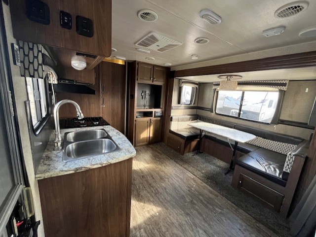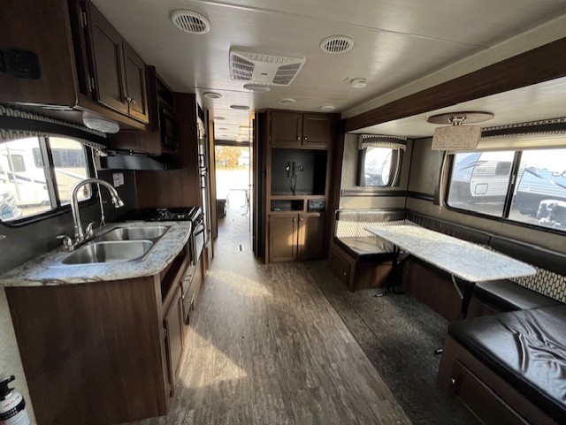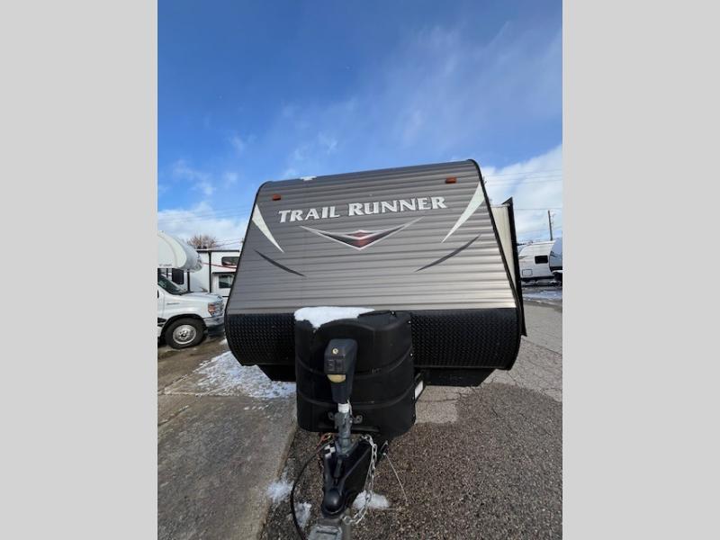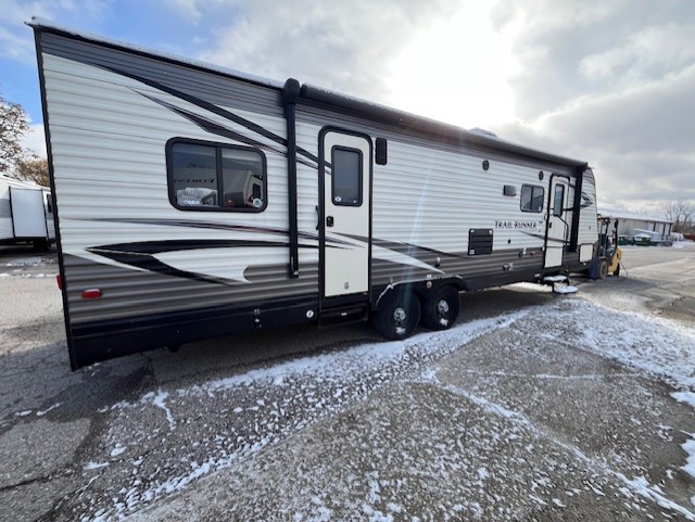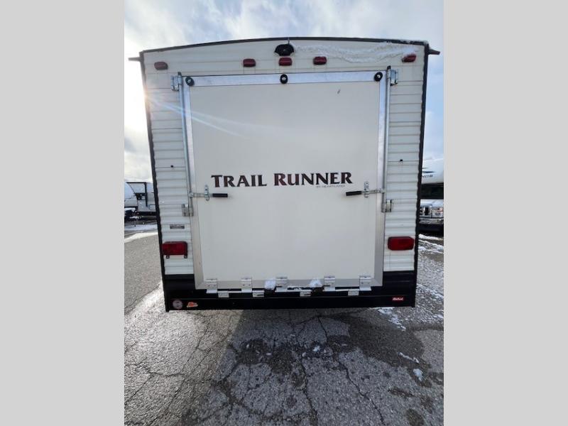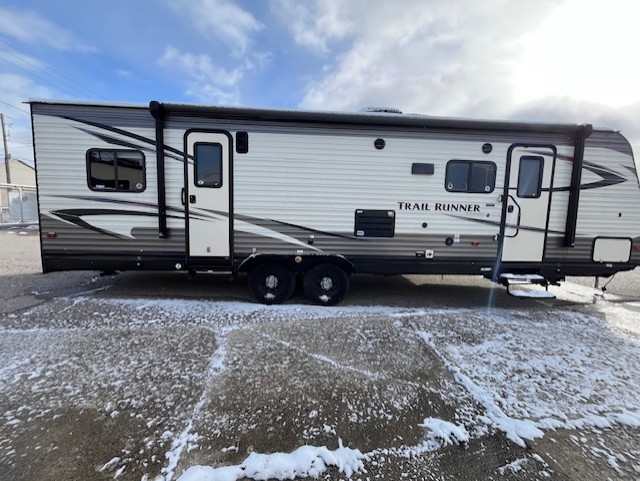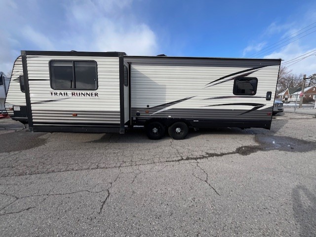 When you choose to camp with a Heartland RV Trail Runner toy hauler you will be camping in style. Each model features an aluminum exterior as well as an aerodynamic front, convenience electric powered slide outs, Dexter E-Z lube axles, black framed radius tinted safety glass windows, and a fully walkable roof. Inside enjoy plenty of lighting with the LED lights, convertible sofas with flip down center consoles, wood pocket sliding doors, an AM/FM/CD/DVD player with Bluetooth capability, and a USB charging port. In the kitchen you will enjoy stainless steel appliances, a high rise pull out kitchen faucet, plus a double door refrigerator. If the standard features are not enough for you, then come check out the list of options, you won't be disappointed!