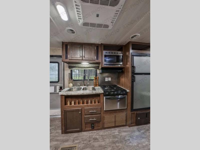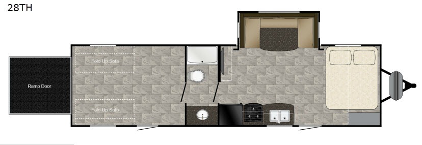 Load up your dirt bikes or a four wheeler, your family, and head on out to the outdoor playground of your choice with this Trail Runner 28TH toy hauler. You will find that it is easy to load and unload your gear with the rear ramp door. Once your riding toys are unloaded then you can easily set up the two fold up sofas which makes for a nice area to sit and reminisce about the day. With the handy side door you can easily get to the garage area without having to walk through the whole trailer. The walk-through bathroom has a door on either side - one leads to the garage area while the other door leads to the combined kitchen and living area.