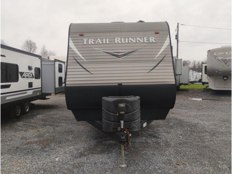 When you choose to camp with a Heartland RV Trail Runner travel trailer you will be camping in style. Each model features an aluminum exterior as well as an aerodynamic front, convenience electric powered slide outs, Dexter E-Z lube axles, black framed radius tinted safety glass windows, and a fully walkable roof. Inside enjoy plenty of lighting with the LED lights, convertible sofas with flip down center consoles, wood pocket sliding doors, an AM/FM/CD/DVD player with Bluetooth capability, and a USB charging port. In the kitchen you will enjoy stainless steel appliances, a high rise pull out kitchen faucet, plus a double door refrigerator. If the standard features are not enough for you, then come check out the list of options, you won't be disappointed!