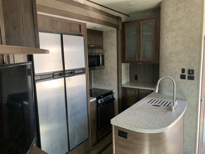When your off-road toys are calling you to new experiences this Highlander toy hauler fifth wheel by Highland Ridge will take you there. Model HF350H offers dual entry, one entrance in the main living area with one side man door in the separate garage. There are dual opposing slide outs in the main living and kitchen area for more interior space for everyone to hang out. The 12 cu. ft. side-by-side refrigerator, and additional kitchen appliances allow you to prepare and cook food anywhere you stop. The convenient half bath in the garage area including the side man door provides easy access for the off-road gang to enter quickly and exit even faster. The master bedroom includes the third slide out, and a king bed, plus more!