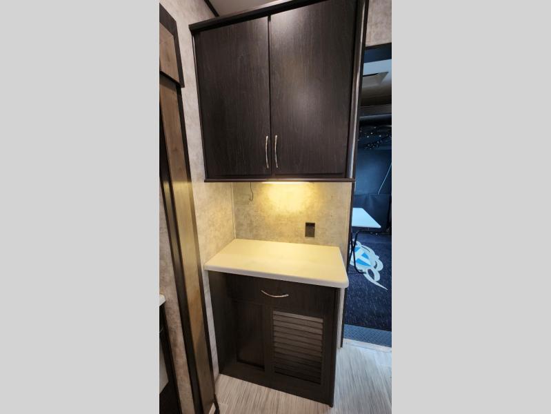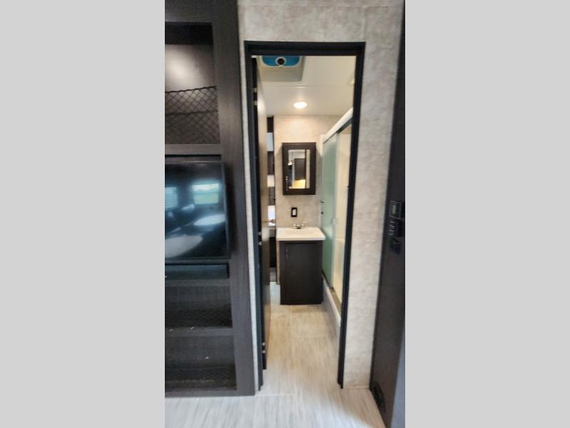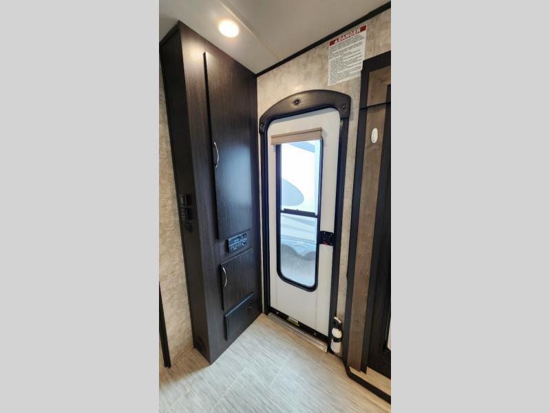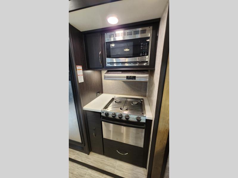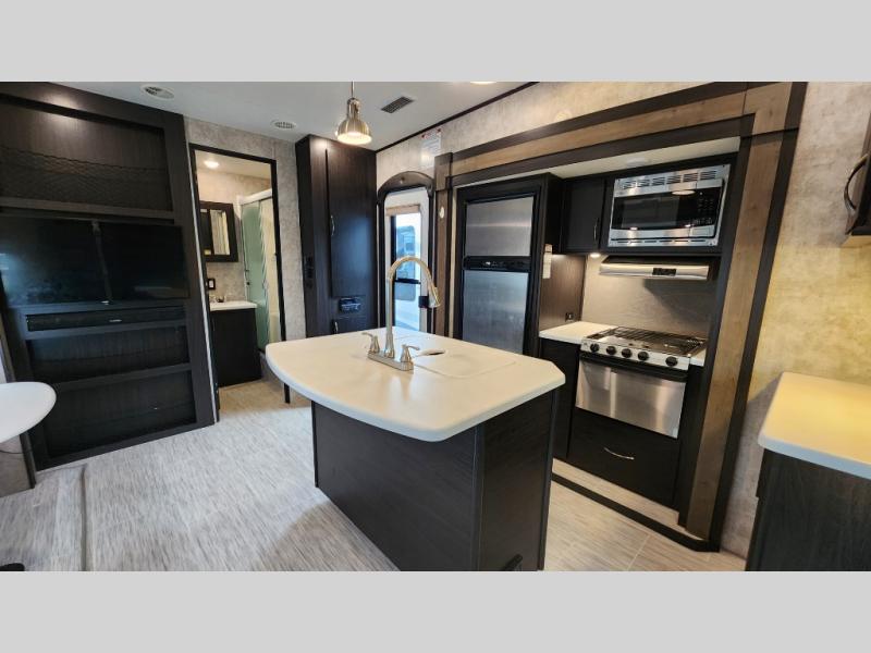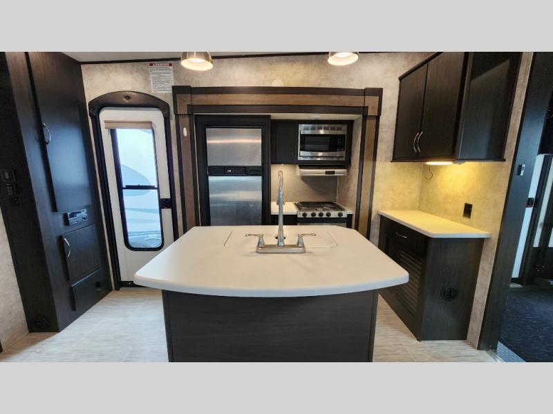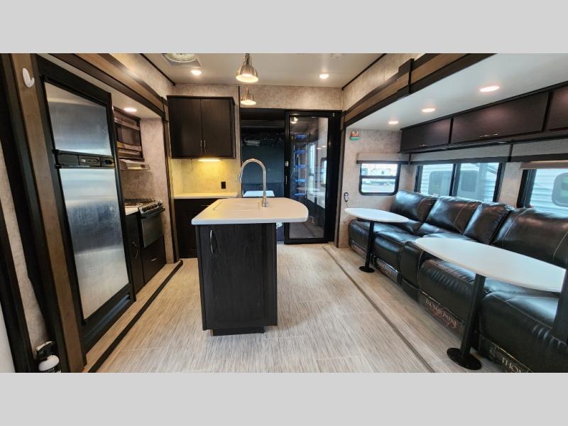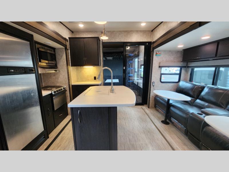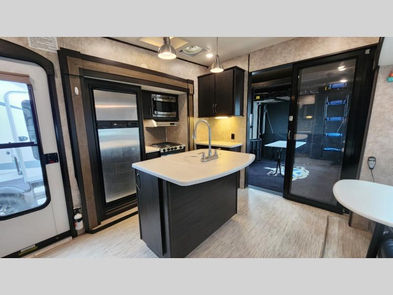 When you are ready for some off-road fun with inside comforts, hitch up this Highlander toy hauler travel trailer by Highland Ridge. Model HT31RGR offers dual entry, one entrance in the main living area with one side man door in the separate garage area. There are dual opposing slide outs in the main living and kitchen area for more interior space for everyone to hang out. The center island, the 8 cu. ft. refrigerator, and additional kitchen appliances allow you to prepare and cook your favorite meals anywhere you stop. The convenient walk-through bath provides quick access from the living area or the front master bedroom, and the queen bed offers an escape after a fun filled day!