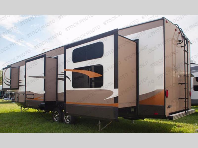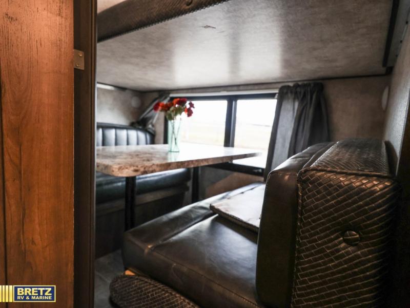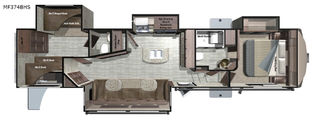 Located in the rear of the fifth wheel there is a spot designed for your kids. In the bunkhouse around the corner from the door there is a set of bunk beds. On the opposite side you will find a slide out with a jack knife sofa and a hinged bunk above. A convenient half bath with a sink and a toilet is next to the sofa. Along the rear wall you will find a wardrobe and an optional TV.