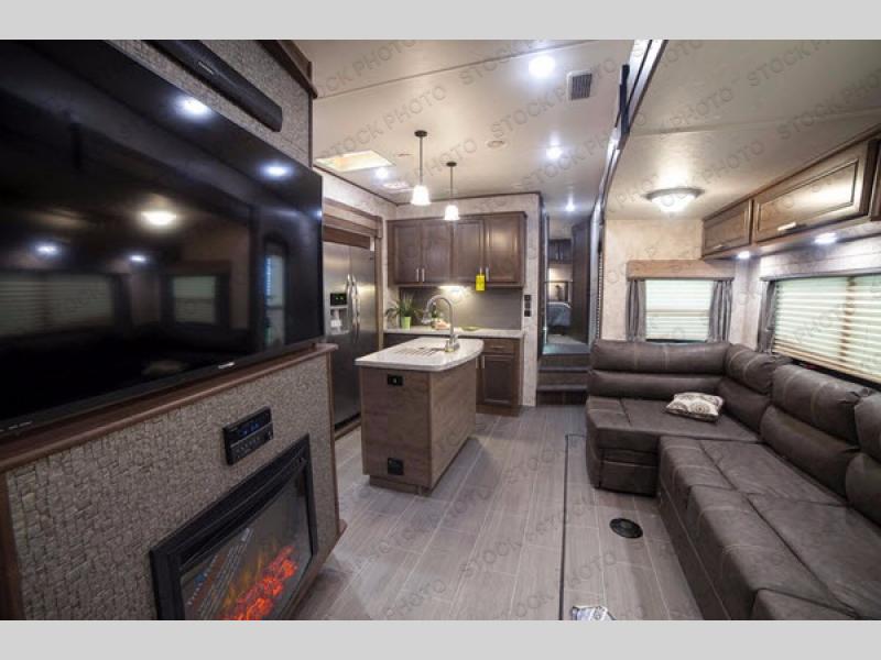 The kitchen area features dual opposing slide outs for added interior space. Along the curb side of this fifth wheel, the slide out features a U-dinette with two pedestal tables. On the opposite side the second slide out has a three burner range, microwave, and a refrigerator (or you can choose an optional 12 cu. ft. or 23 cu. ft. residential refrigerator). Along the interior wall there is extra counter space that can be used for meal prep, and above you will find overhead cabinets. Easily clean up from your meal at the double sink which is located on the island. You will also find a closet area that has been washer/dryer prepped for your convenience.