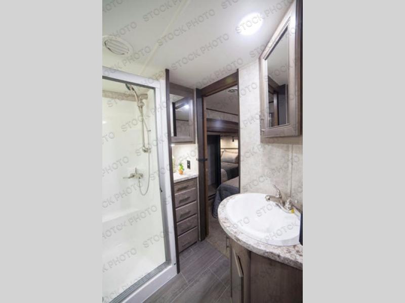 Moving forward on the fifth wheel, you will step up a few stairs, and the bathroom is on your left. Here you will find a toilet, shower with seat, linen storage, and a sink with a medicine cabinet. A convenient sliding door leads into the bedroom from the bathroom, or you can use the hall entrance.