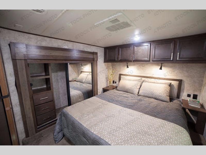 In the front bedroom there is a king bed, nightstands, and overhead cabinets. Along the road side wall you will find a slide out wardrobe for your hanging clothes.