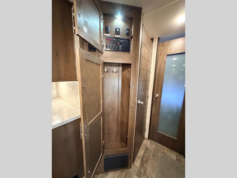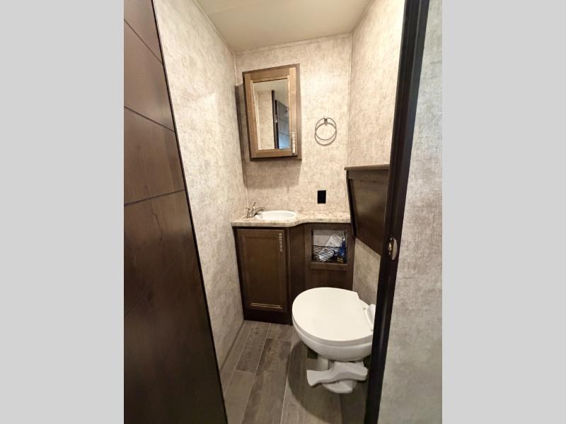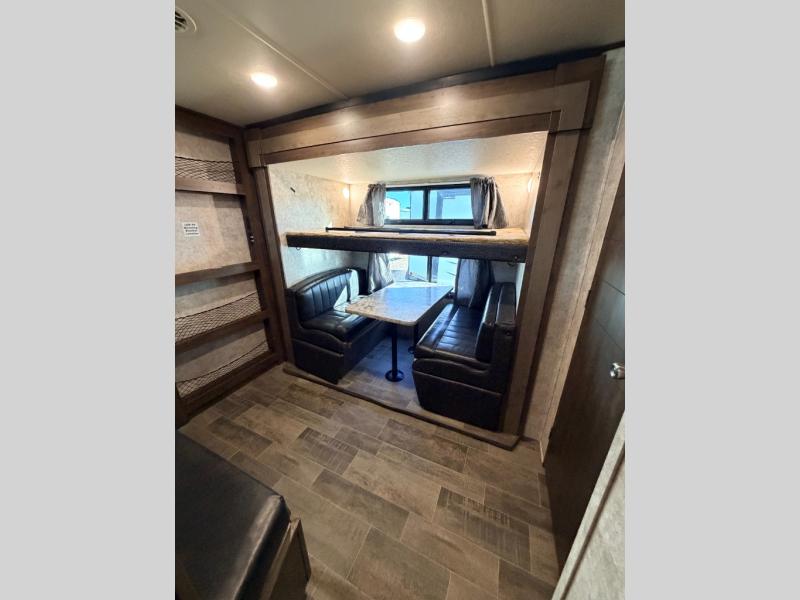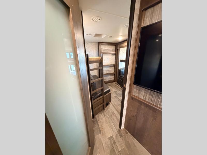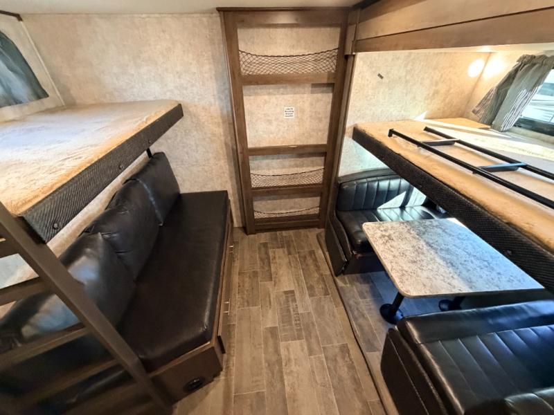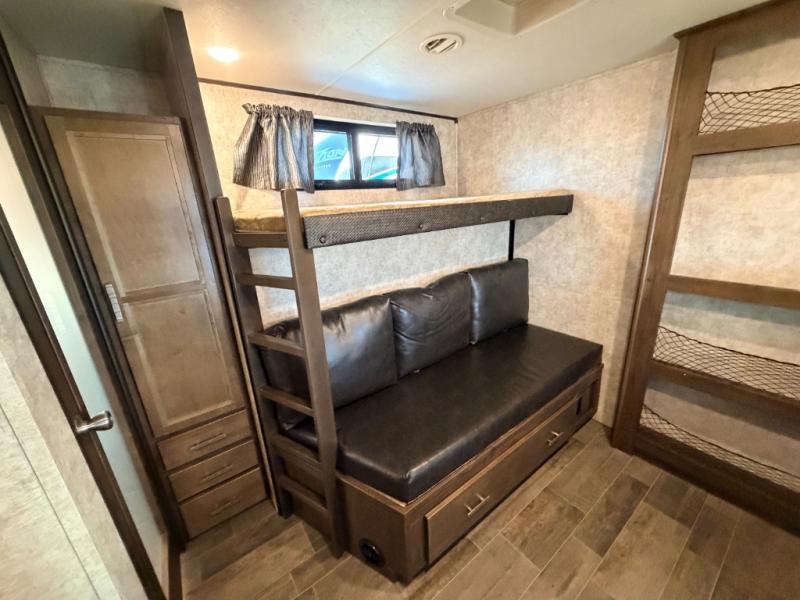 Heading towards the rear of the trailer you will enter the private bunkhouse. Inside there is a slide out jiffy hide-a-bed sofa below a hinged bunk along the road side wall. Adjacent there is a convenient half bath. Along the rear wall you can enjoy a 29" TV if you choose that option, and a hutch for storing movies, toys, and games. A set of bunks and a ladder are located on the opposite side as the slide out allowing for more sleeping space. There is wardrobe in the corner for your camping clothes.