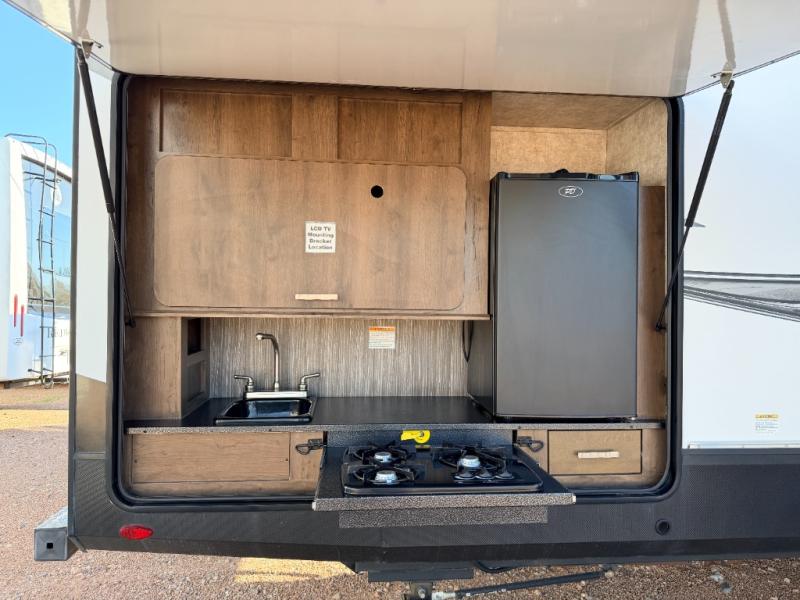 If you have been searching for a travel trailer with four slide outs for more interior floor space, a private rear bunkhouse for the kids, a bath and a half for convenience, and an exterior kitchen for the outdoor chef in the family, then take a look at this Mesa Ridge MR328BHS today!
