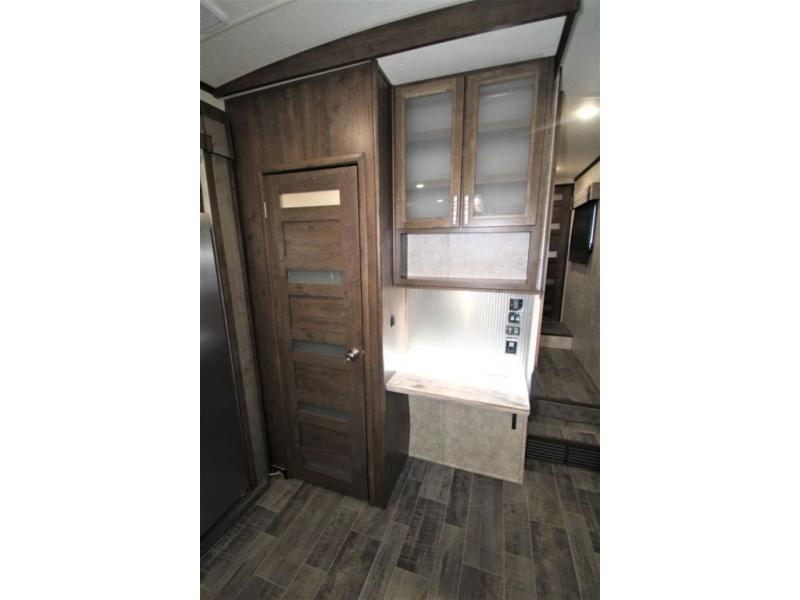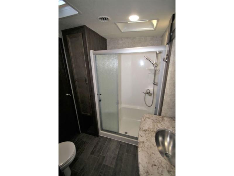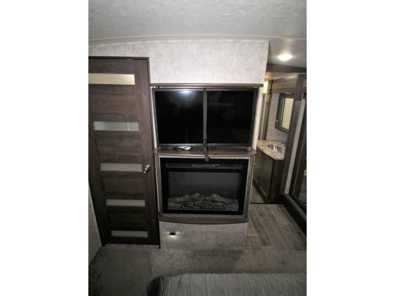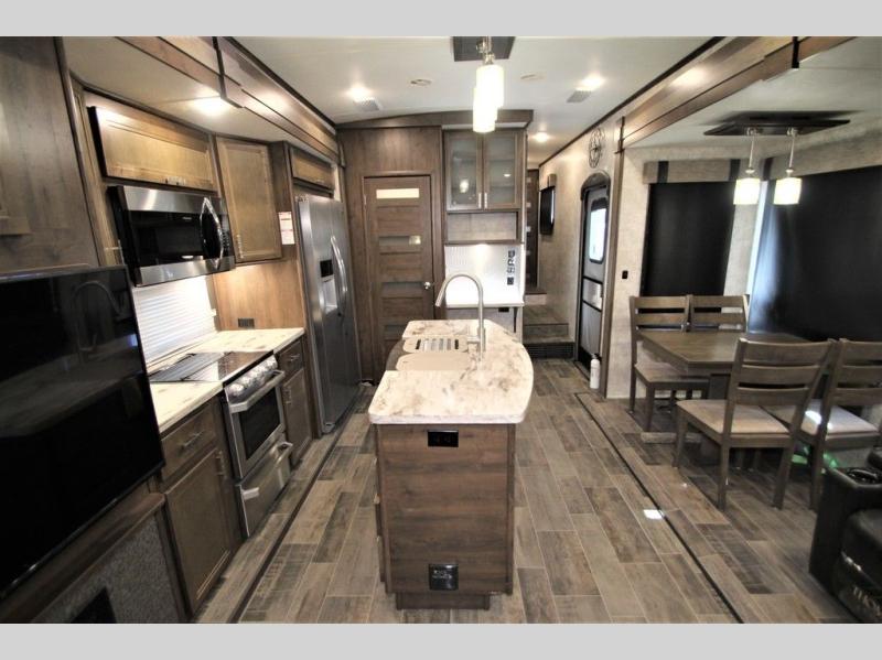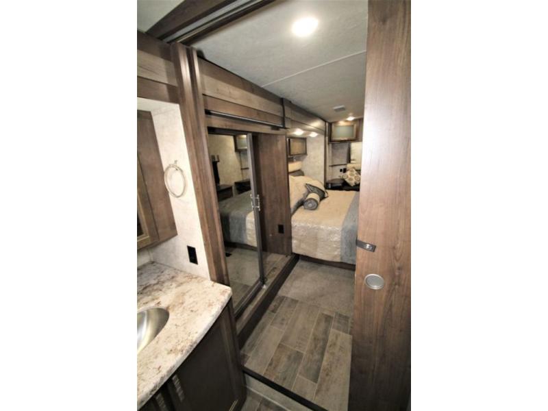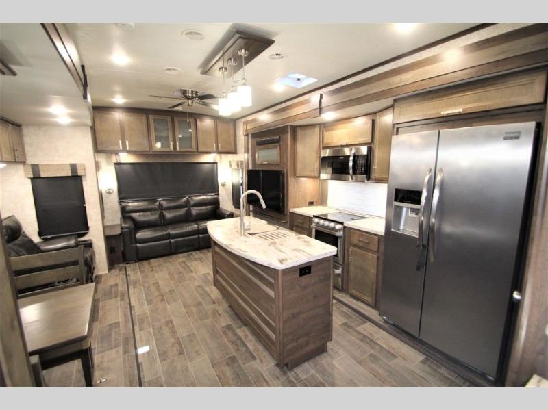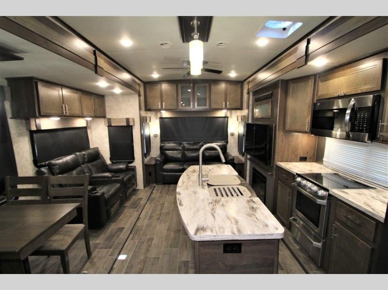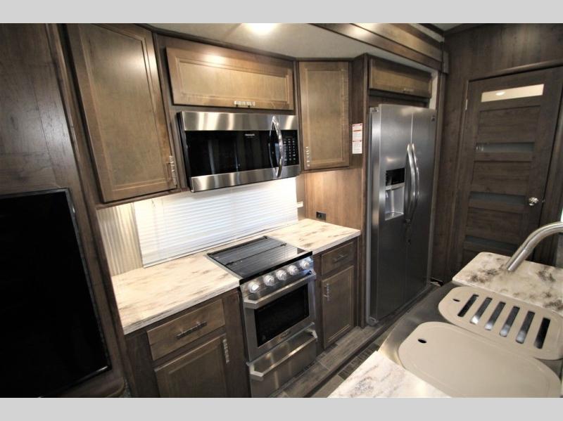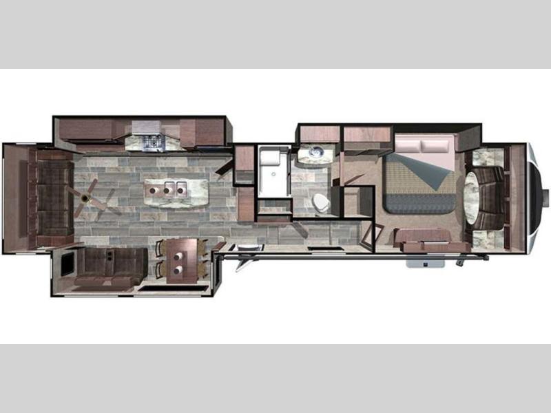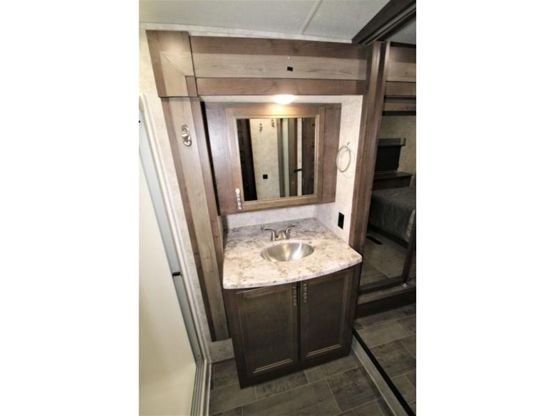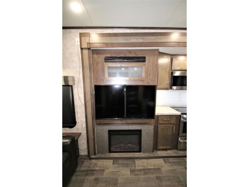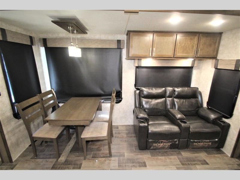 Back down at the main level notice the wide open space thanks to dual opposing slide outs. There is a dining table with four chairs and theater seating for two with cup holders along the curb side. Opposite find a kitchen with a three burner range including overhead microwave oven, refrigerator, pantry, and an entertainment center, plus fireplace all within a slide out. You can even choose an optional 12 cu. ft. refrigerator or 23 cu. ft. residential refrigerator. There is overhead storage and counter space with a double sink along the interior wall, plus an optional center island on casters for added prep space and serving area if you like.