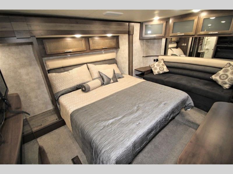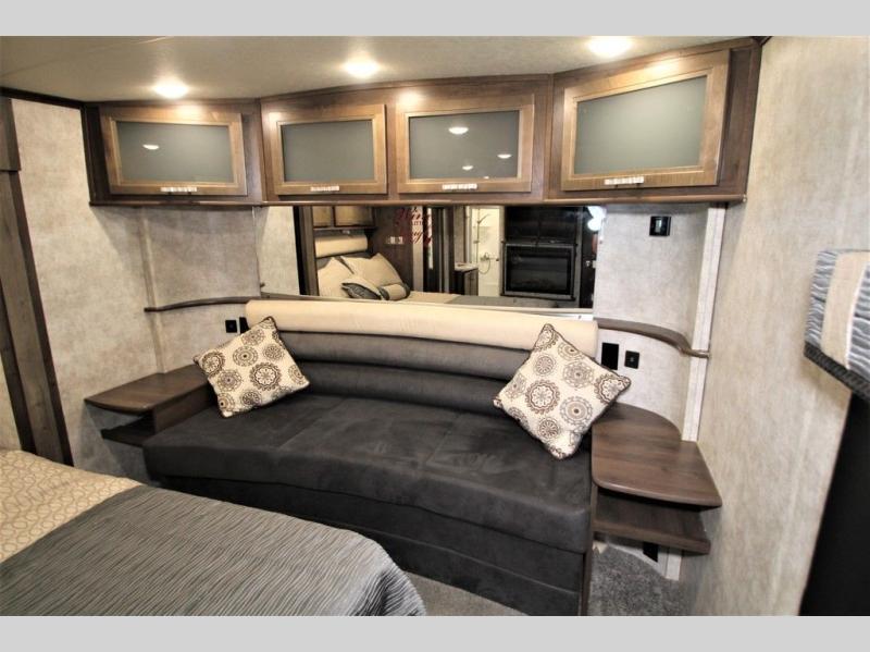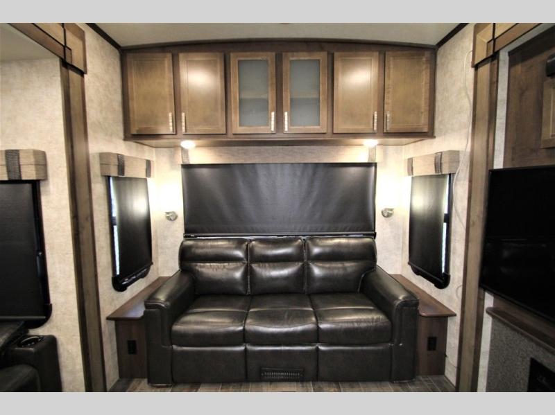 Along the rear wall enjoy the tri-fold sofa with queen bed and end tables for seating or sleeping space, plus so much more!