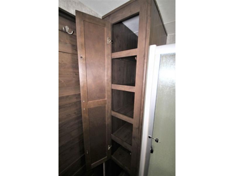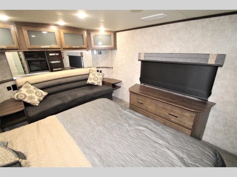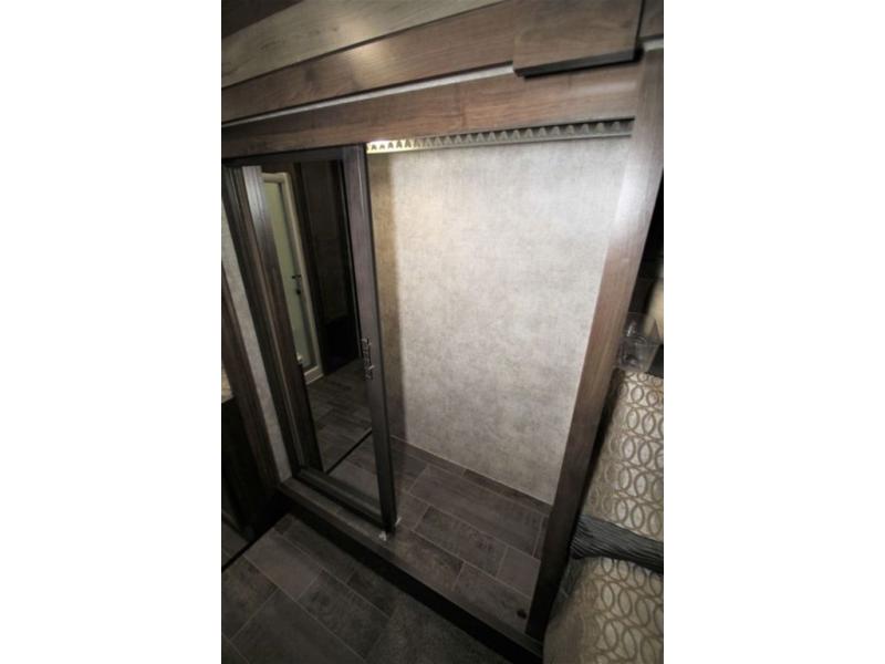 You can also use the hallway door to enter the front master bedroom. Here a king bed slide out offers more foot traffic space to move around. There is a dresser opposite with an optional TV overhead, and a front wall wardrobe with sliding mirrored doors. There is also a washer and dryer prepped closet if you choose to add the appliances.
