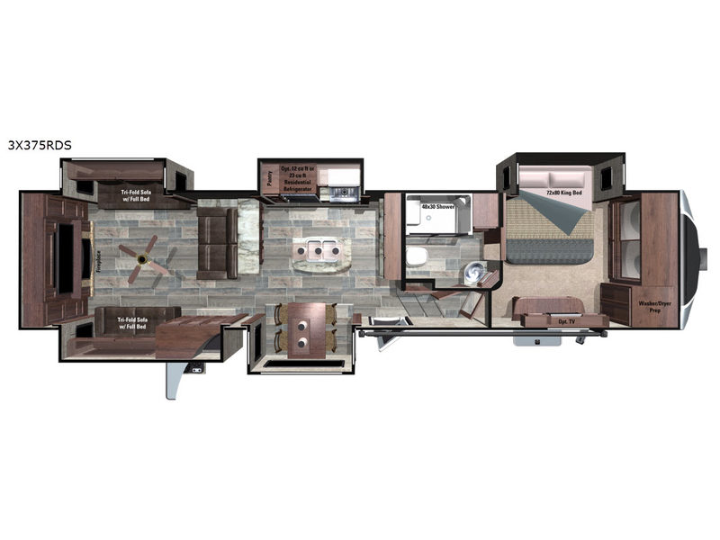 This Open Range 3X fifth wheel features dual opposing slides in the rear living area, dual opposing slides in the kitchen, and a slide out king bed in the front bedroom. That makes FIVE total slide outs for more interior floor space throughout this model 375RDS.