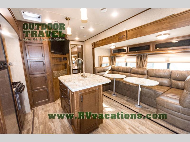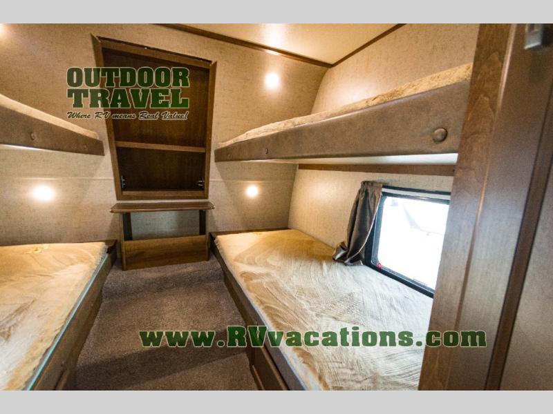 In the front of the fifth wheel you will find a private bunkhouse with two sets of bunk beds allowing for sleeping space for four, cabinets and drawers on each side, and a location for an optional TV up front, plus so much more inside and outside!