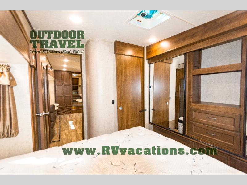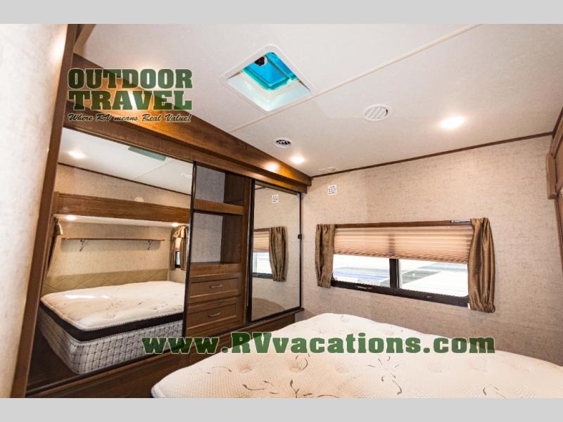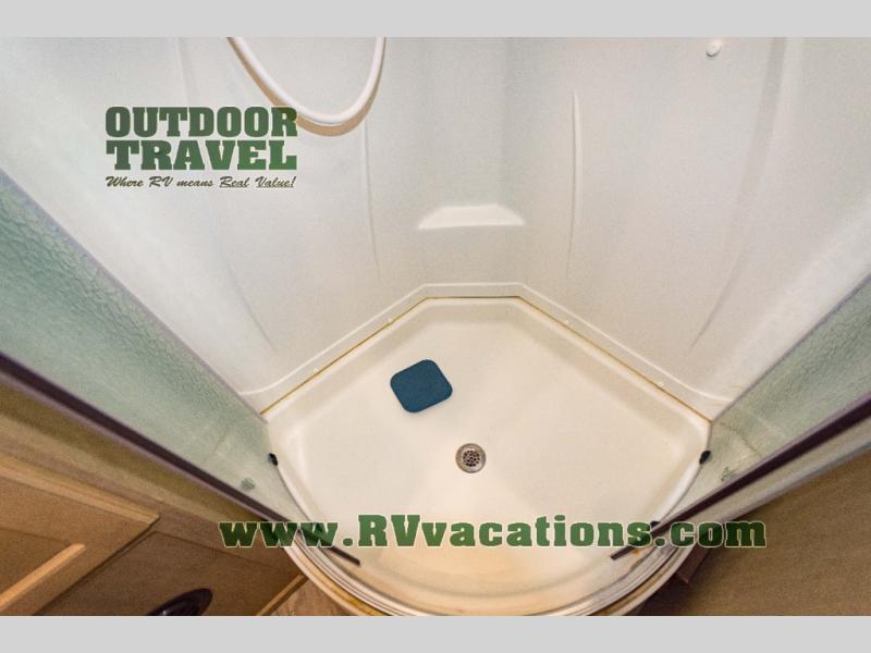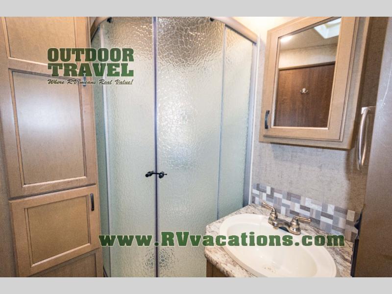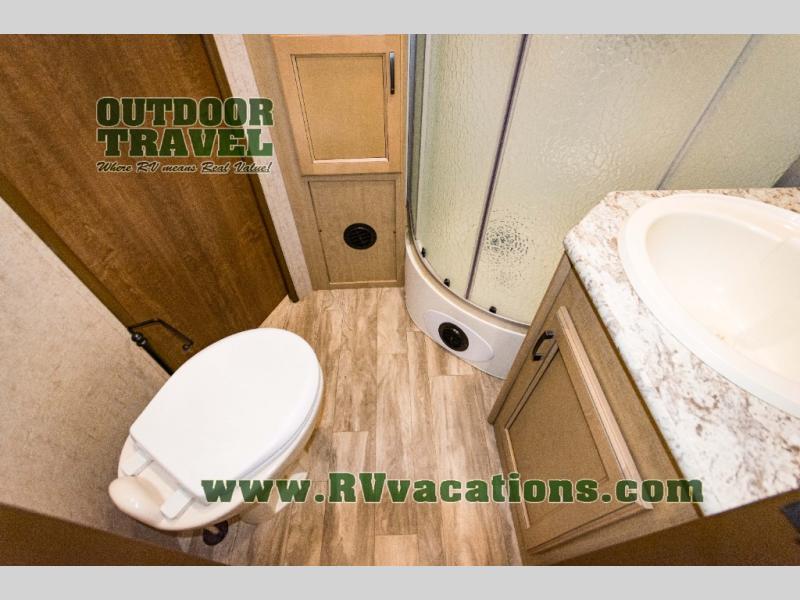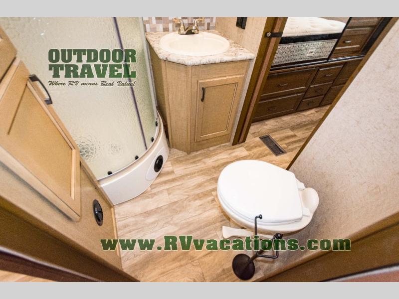 The complete bath features a toilet, sink, linen cabinet, and radius shower. There is also a second entry door that leads directly into the rear master bedroom where you will find a wardrobe with storage drawers below, and a queen bed slide.