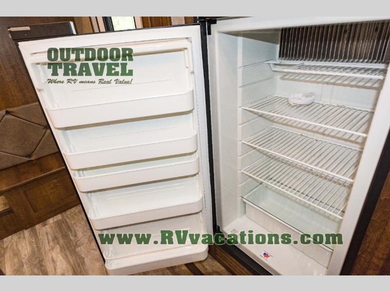 As you enter to your left there is a slide out refrigerator, three burner range, microwave, and storage is next to the slide. Opposite enjoy a U-Lounge with fold-out queen bed, plus two tables for dining or playing games. Watching TV while you eat or visit is made easy with the entertainment center along the angled outside wall of the bath. A kitchen island with a double sink for easy clean up is in the center of this area. Additional cabinet storage is available along the interior wall on each side of the bunkhouse's entry door including a bench.
