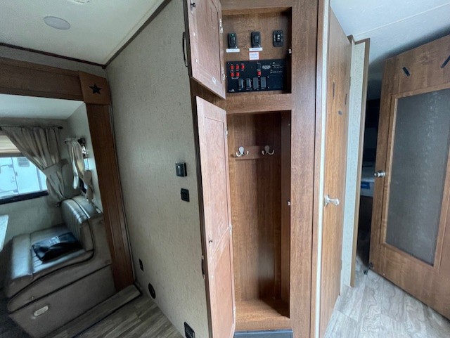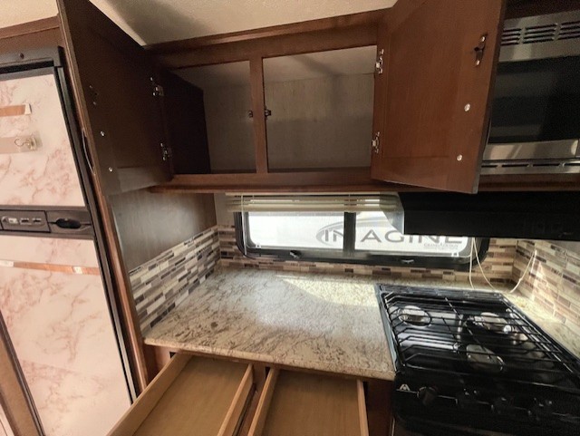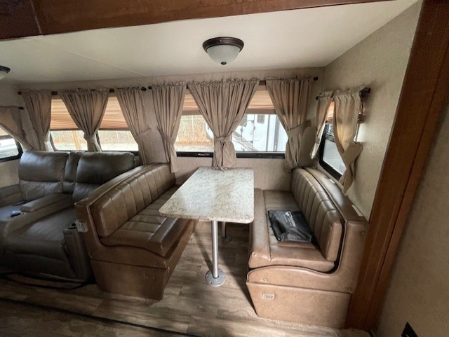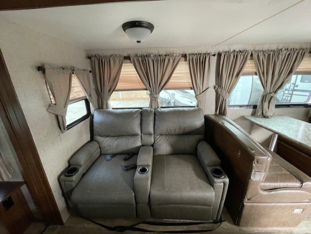 Along the rear wall there is a tri-fold sofa with a queen bed including storage above to help keep things tidy and neat. The slide opposite features more seating with a theatre seat for two including cup holders, and a booth dinette. Both of which provide cabinets above for more storage needs. You can choose a U-lounge with fold-out queen bed and two tables option instead for seating and dining space if you wish.