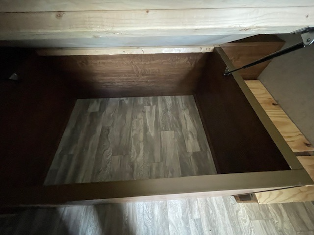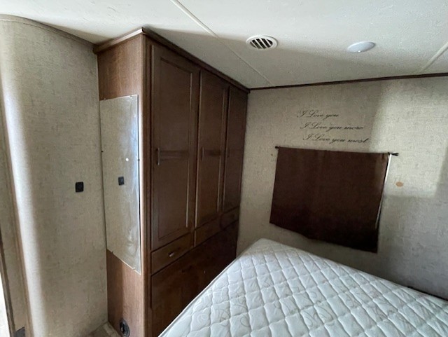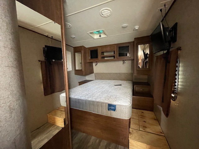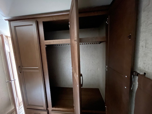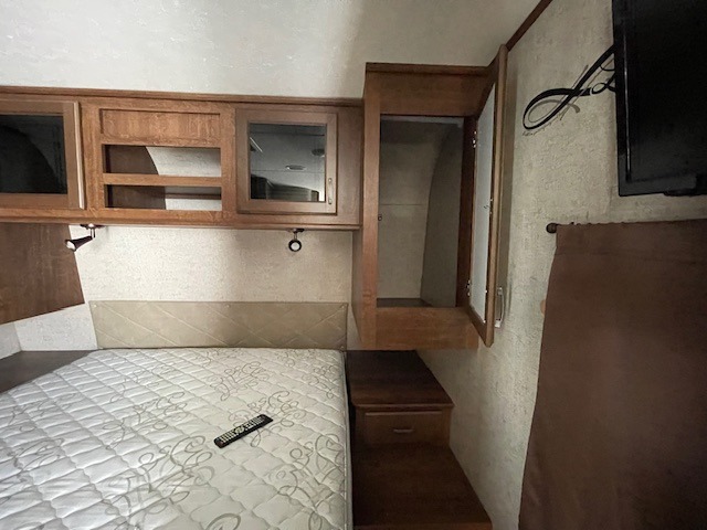 The front master bedroom features a large wardrobe for clothing storage, a queen size bed with overhead cabinets, and two shirt closets above nightstands, one on each side.