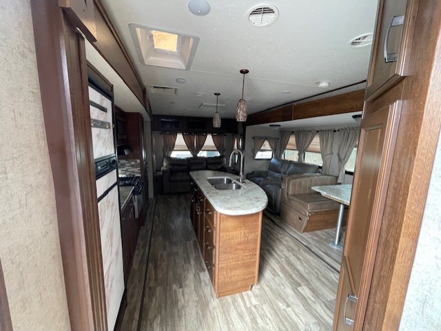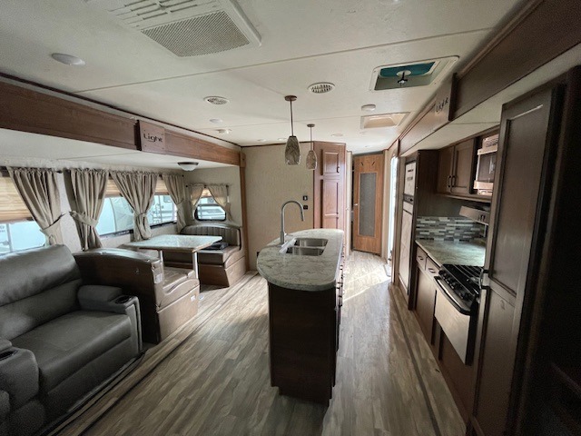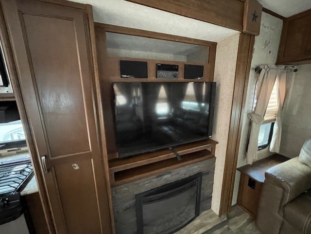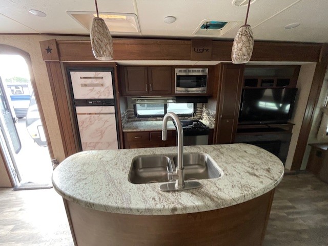 Along the curb side wall you will find a large slide out kitchen and entertainment center that starts with a refrigerator, a three burner range with overhead microwave, and a pantry. Overhead cabinets, lower cupboards and drawers provide ample storage for dishes and food items. The kitchen island off center features more counter prep space, plus it is the location of the double sink for easy clean up. At the end of this slide you will find an entertainment center with fireplace which can easily be viewed from any seating in the room.