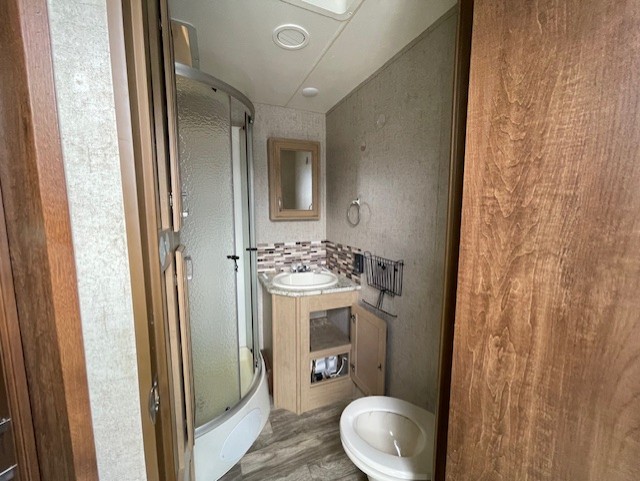 As you enter notice the convenient location of the bathroom straight ahead. Inside find a radius shower, toilet, sink, and linen cabinet.