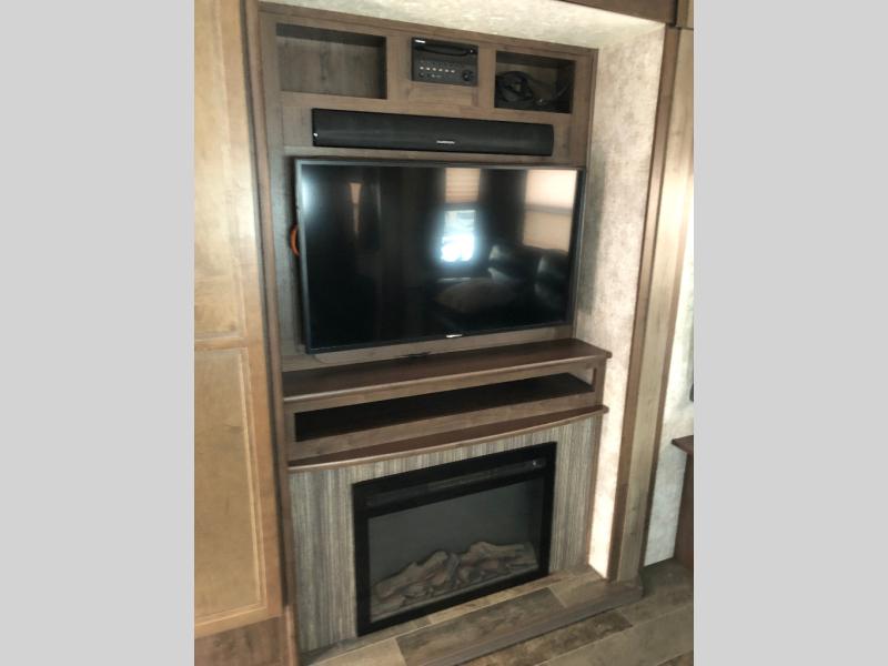 To the left of the entry find the kitchen where you can enjoy cooking for your family. There is a slide out refrigerator, three burner range with overhead microwave oven, and pantry for your non-perishables. The kitchen island has a double sink, plus added counter space for food prep and more. The kitchen slide also features an entertainment center and fireplace.